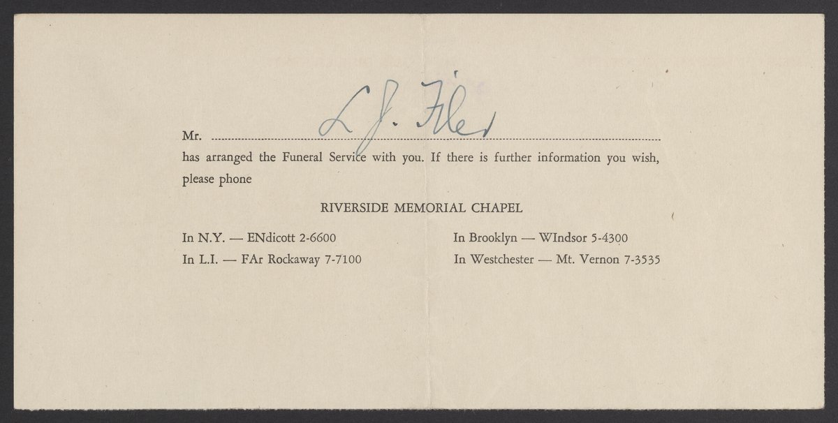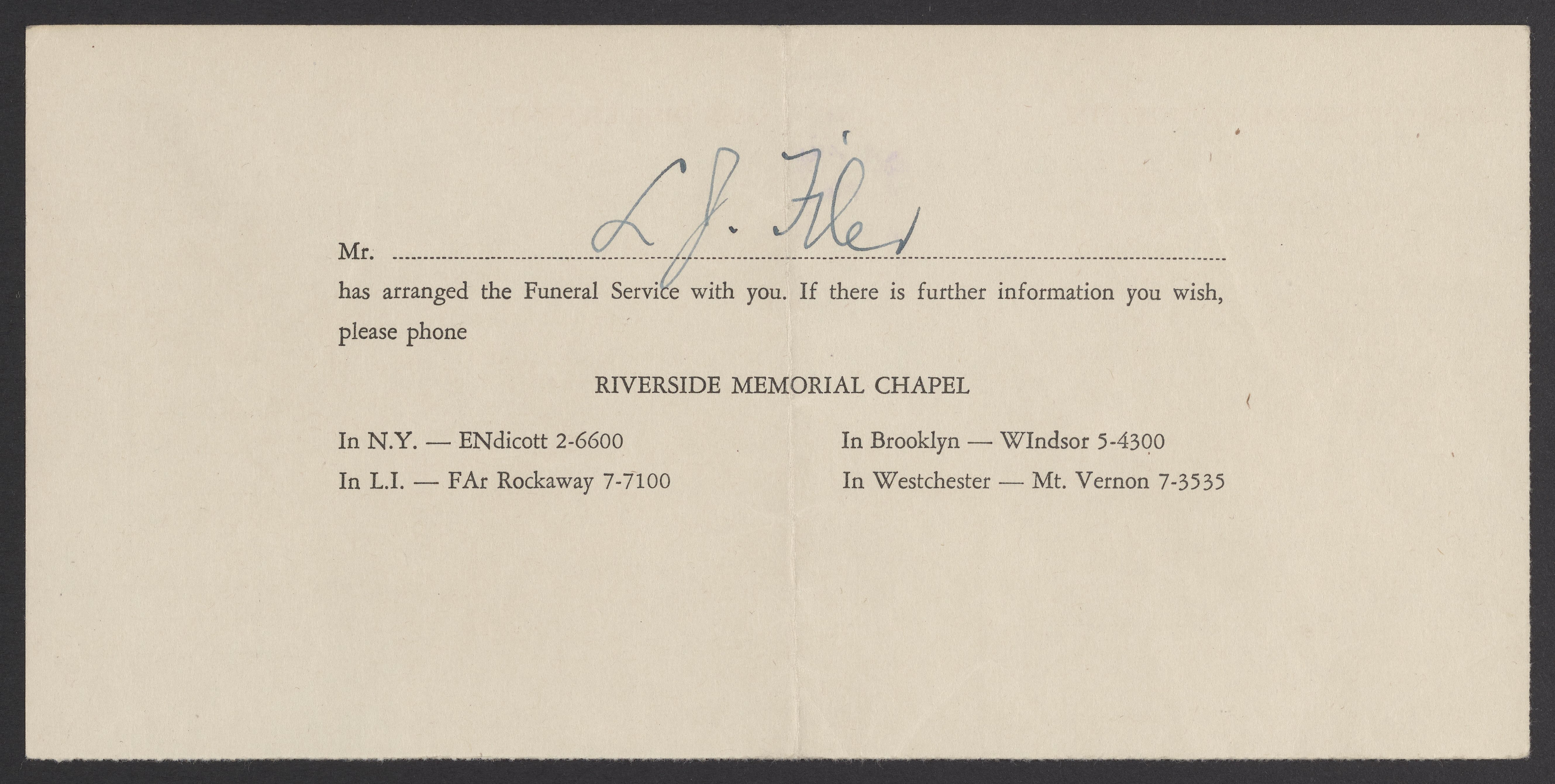 “Contact Card for Georg Bredig's Funeral Service,” 1944. Papers of Georg and Max Bredig, Box 10, Folder 13. Science History Institute. Philadelphia. https://digital.sciencehistory.org/works/bwbfayd.