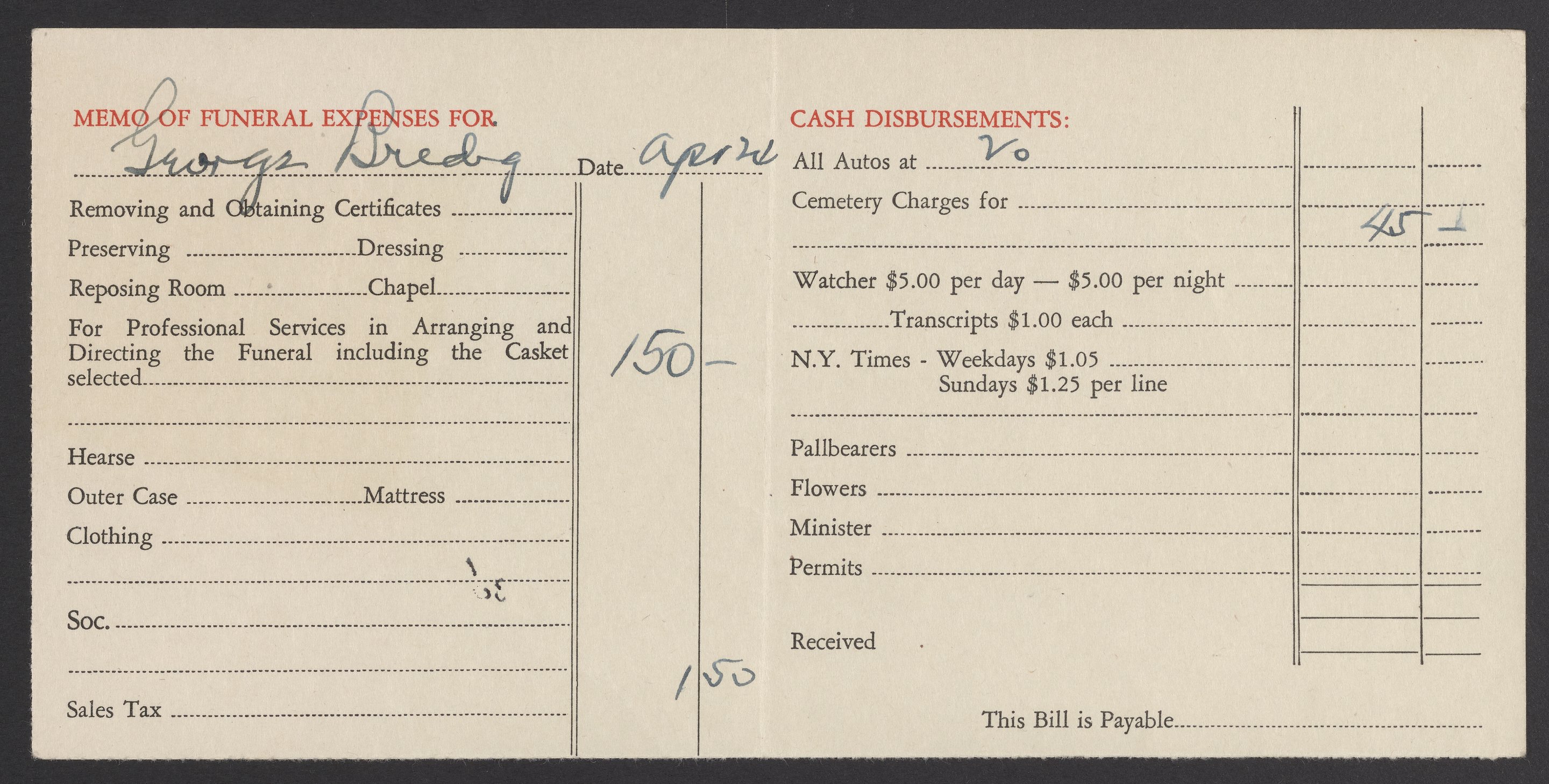 Small JPG1200 x 606px — 79.3 KBLarge JPG2880 x 1453px — 527 KBFull-sized JPG5318 x 2683px — 1.8 MBOriginal fileTIFF — 5318 x 2683px — 40.9 MBContact information for the person who helped arrange Georg Bredig's (1868-1944) funeral service. The card includes charges for the funeral.