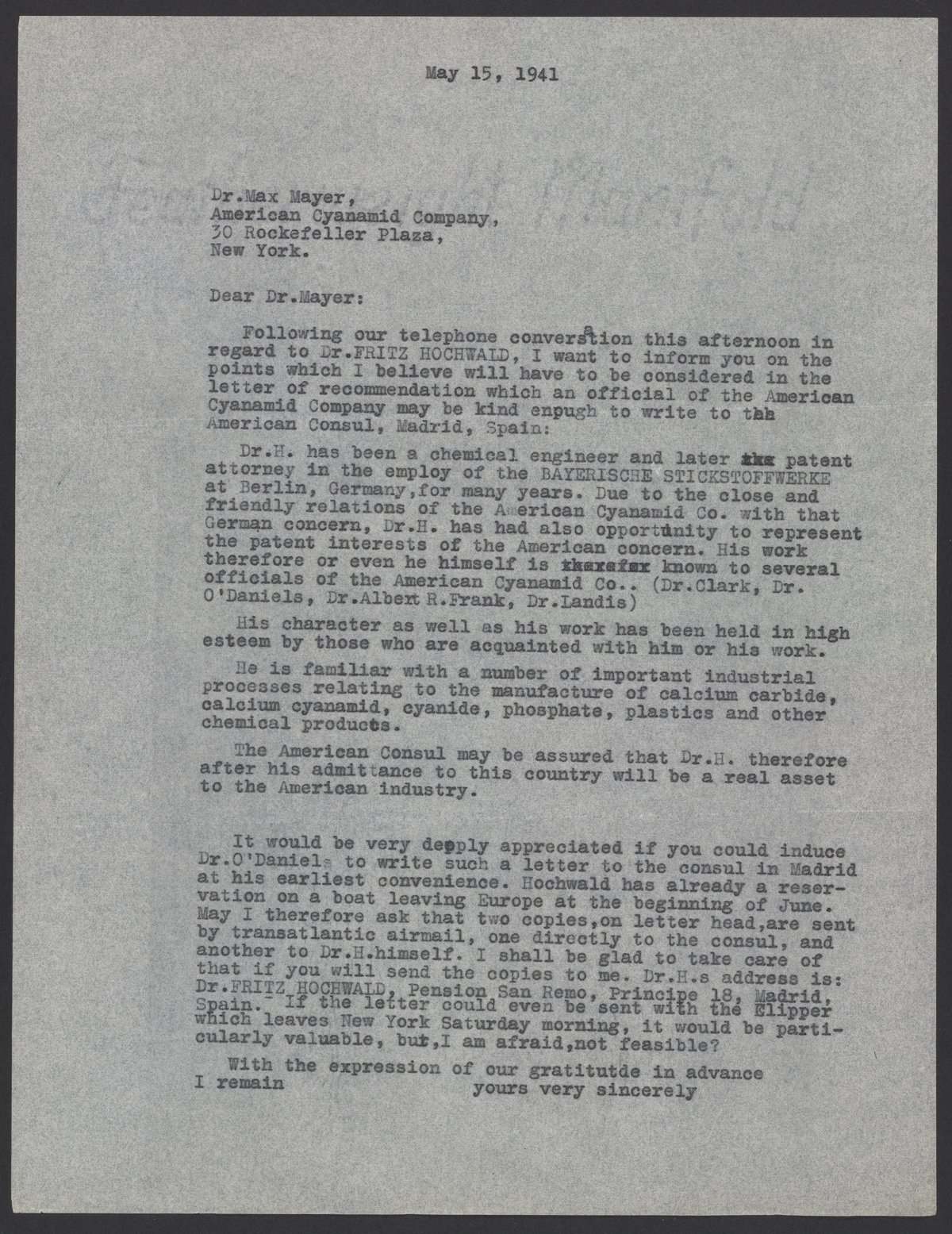 Letter from Max Bredig to Max Mayer, May 15, 1941
