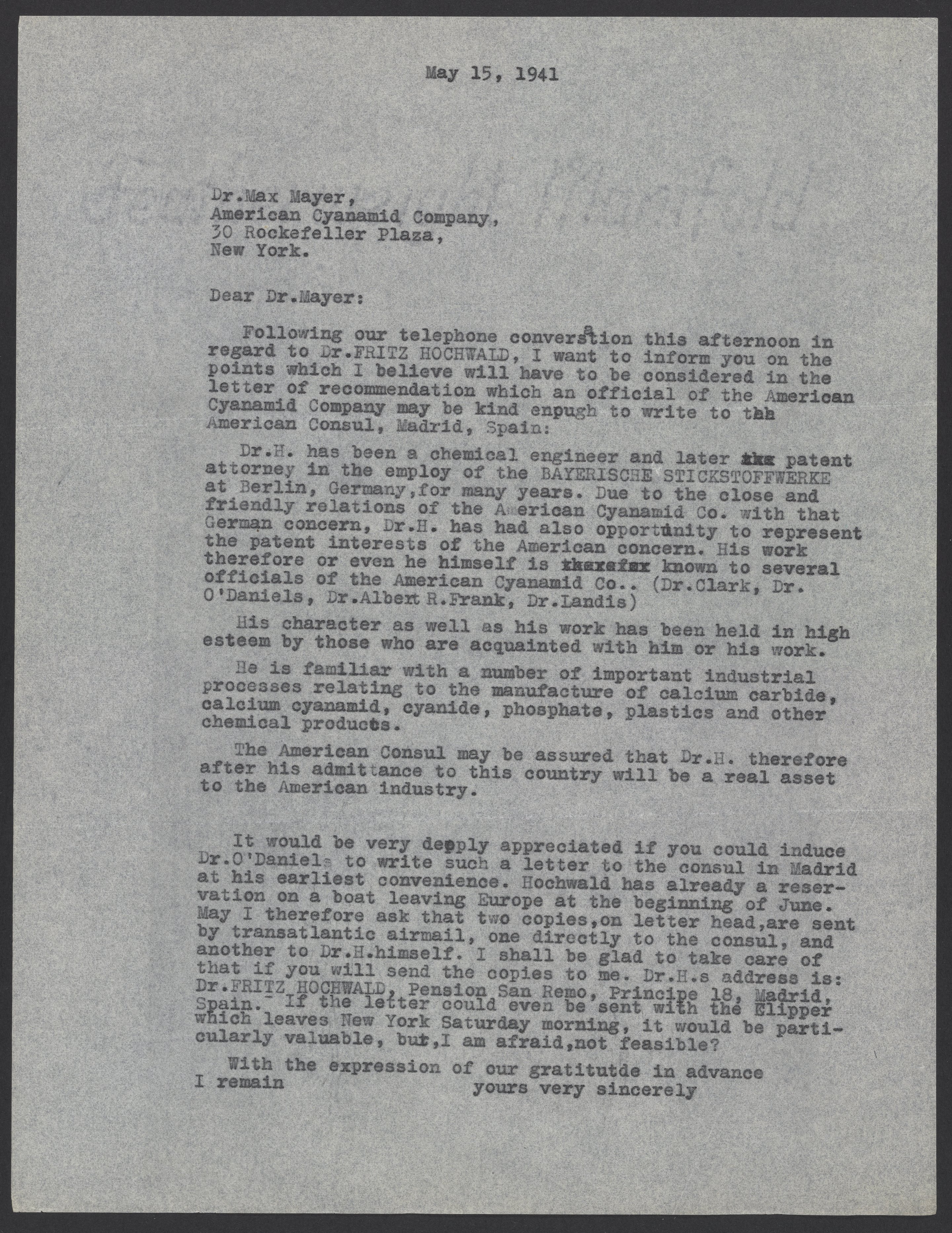 Max Bredig (1902-1977) writes to Max Mayer, regarding a letter of recommendation for Fritz Hochwald (1897-1968). Bredig speaks highly of Hochwald and asks Dr. O'Daniels to write a letter reflecting the contents of this letter.