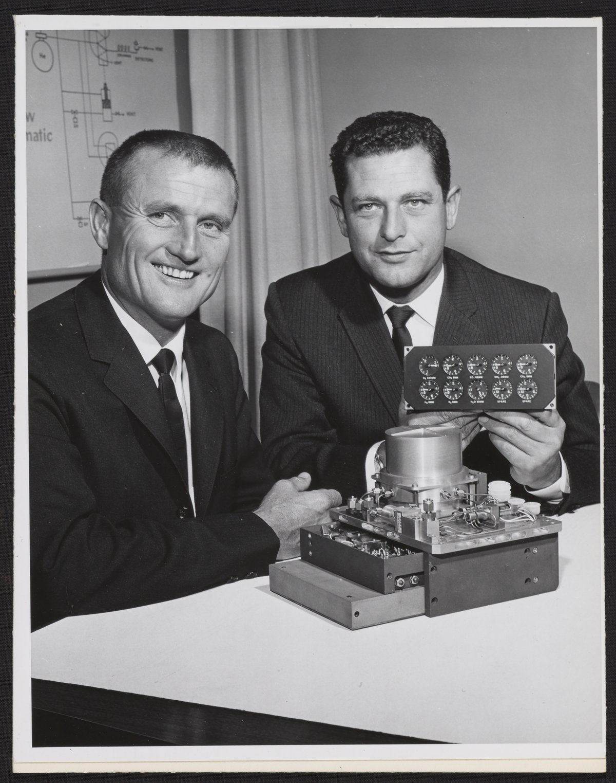 “Walt Donner and Jim Cook with Gas Chromatograph,” 1960. Beckman Historical Collection, Box 55, Folder 147. Science History Institute. Philadelphia. https://digital.sciencehistory.org/works/bz60cw32f.
