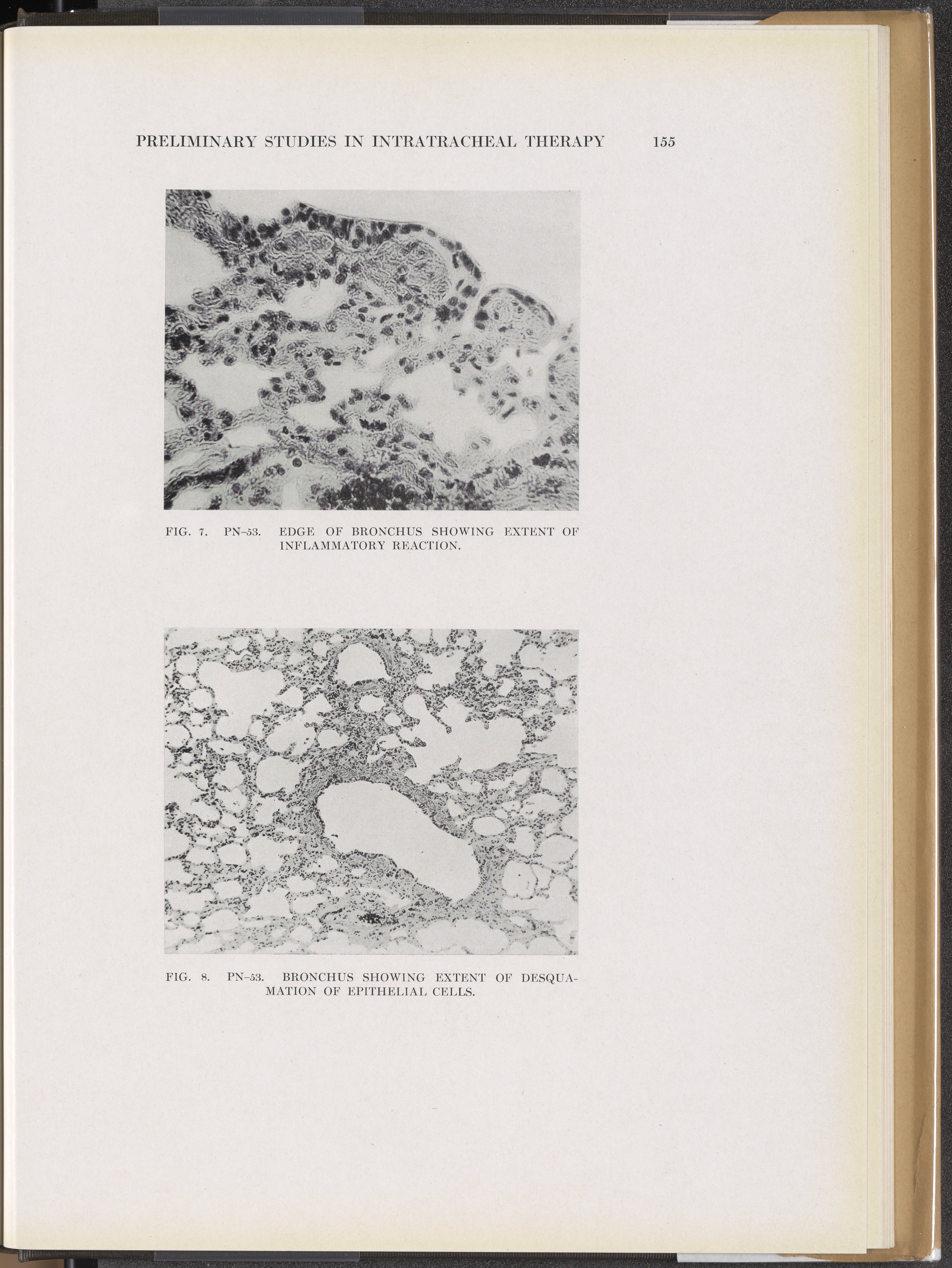 Fig. 7: Edge of bronchus showing extent of inflammatory reaction. Fig. 8: Bronchus showing extent of desquamation of epithelial cells.