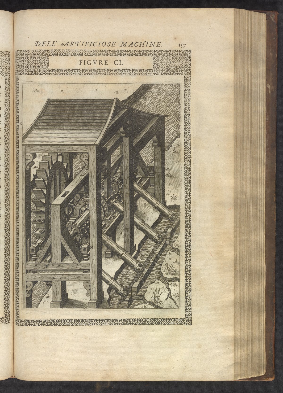 Ramelli, Agostino. “Plate 101: Device for Draining Water from a Swamp or Pool by River Current.” In Le Diverse Et Artificiose Machine Del Capitano Agostino Ramelli. Paris, France, 1588. https://digital.sciencehistory.org/works/c247ds29p.