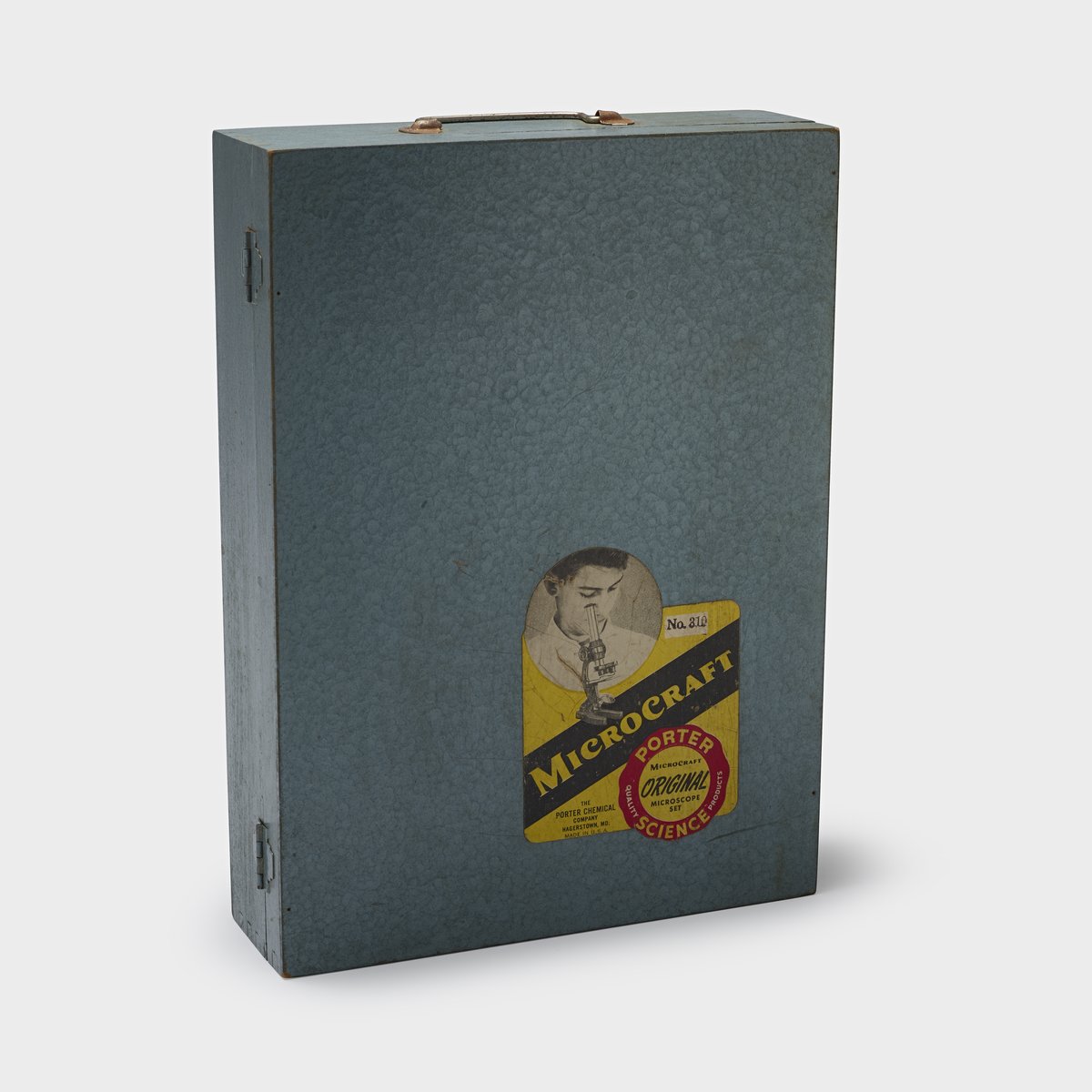 Small JPG1200 x 922px — 159 KBLarge JPG2880 x 2213px — 740 KBFull-sized JPG8621 x 6625px — 5.8 MBOriginal fileTIFF — 8621 x 6625px — 163 MBWooden grey-blue case that opens on a hinge. Inside, the left side of the case contains a sealed glass bottle of mounting cement, a sealed glass bottle of thinner, small cardboard boxes labeled "Microcraft Microscopy feather" and "Microcraft Microscopy mica", a pair of tweezers, a needle, three test tubes with cork stoppers one containing sodium ferrocyanide, one containing uranium ore, the last containing diatomaceous earth, and an empty paper packet labeled "Microcraft Slide Glass". The right side of the case contains a glass stirring rod, two boxes labeled "Microcraft Microscopy fish scales" and "Microcraft Microscopy sponge", one paper packet labeled "Microcraft Slide Glass" containing glass slides, one paper packet labeled "Microcraft Microscopy Slide Labels" containing paper labels, and a microscope. Set includes manual, microscope instructions, and an inspection information card.