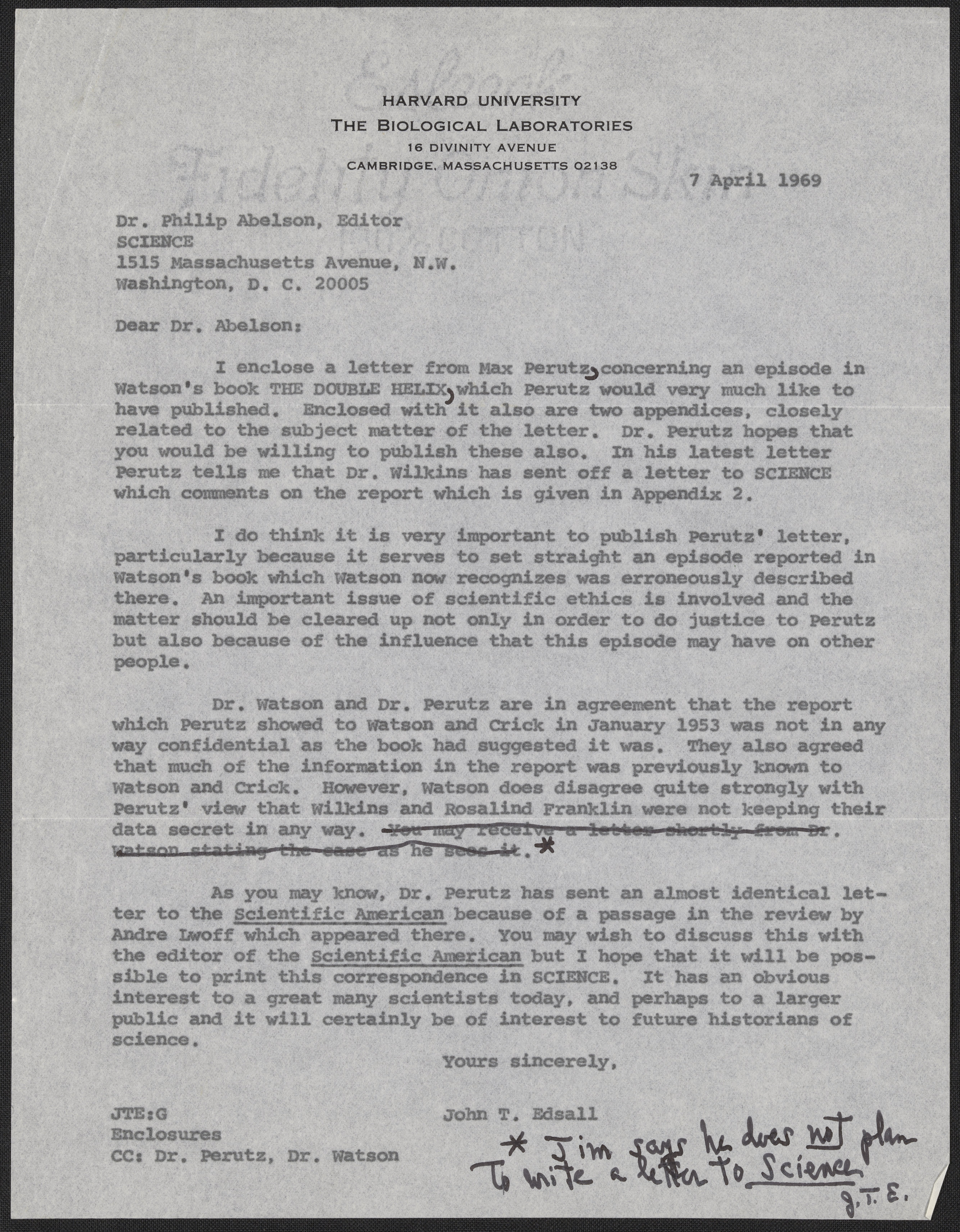Letter from John T. Edsall to Philip Abelson, April 7, 1969