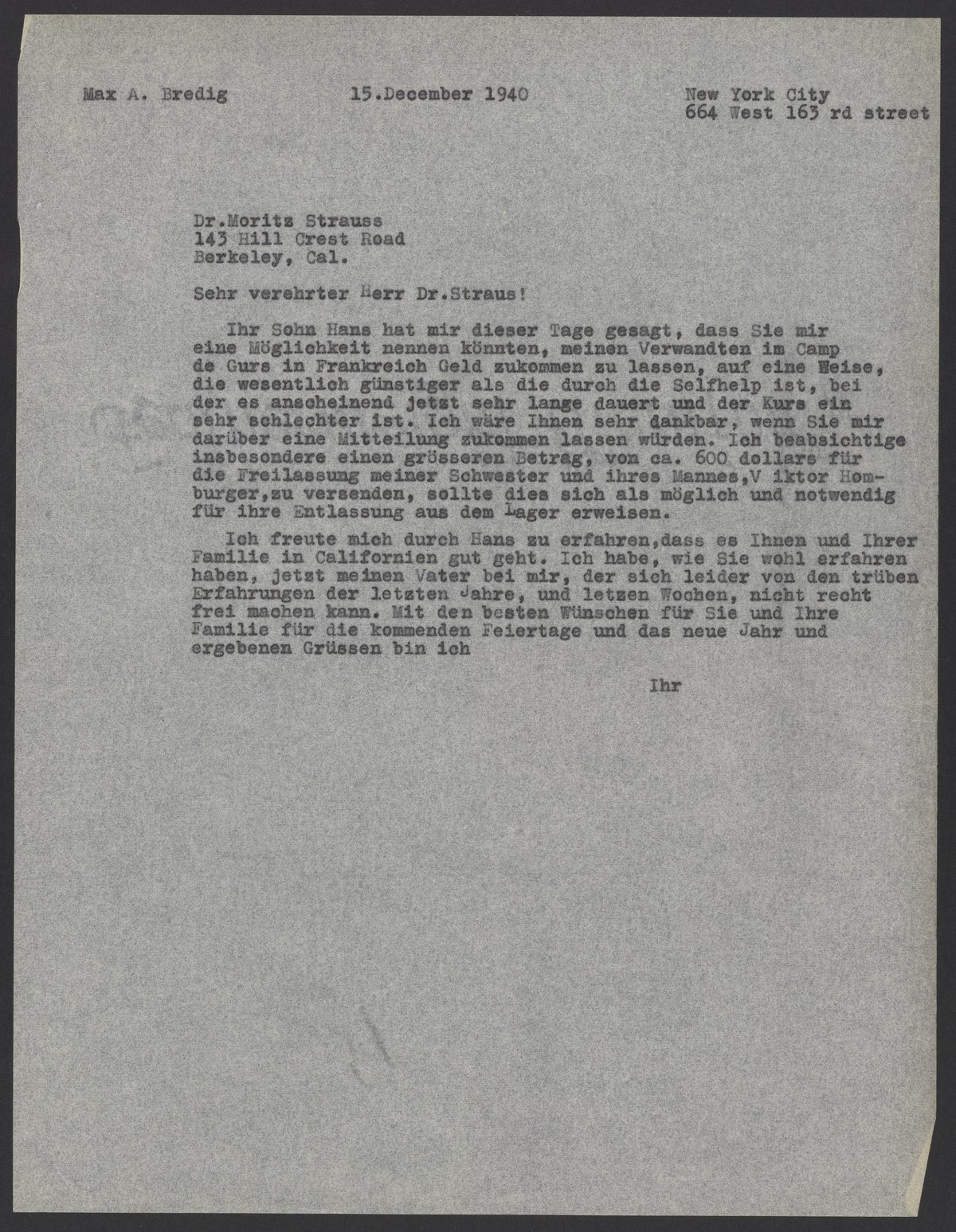 Letter from Max Bredig to Moritz Straus, December 15, 1940