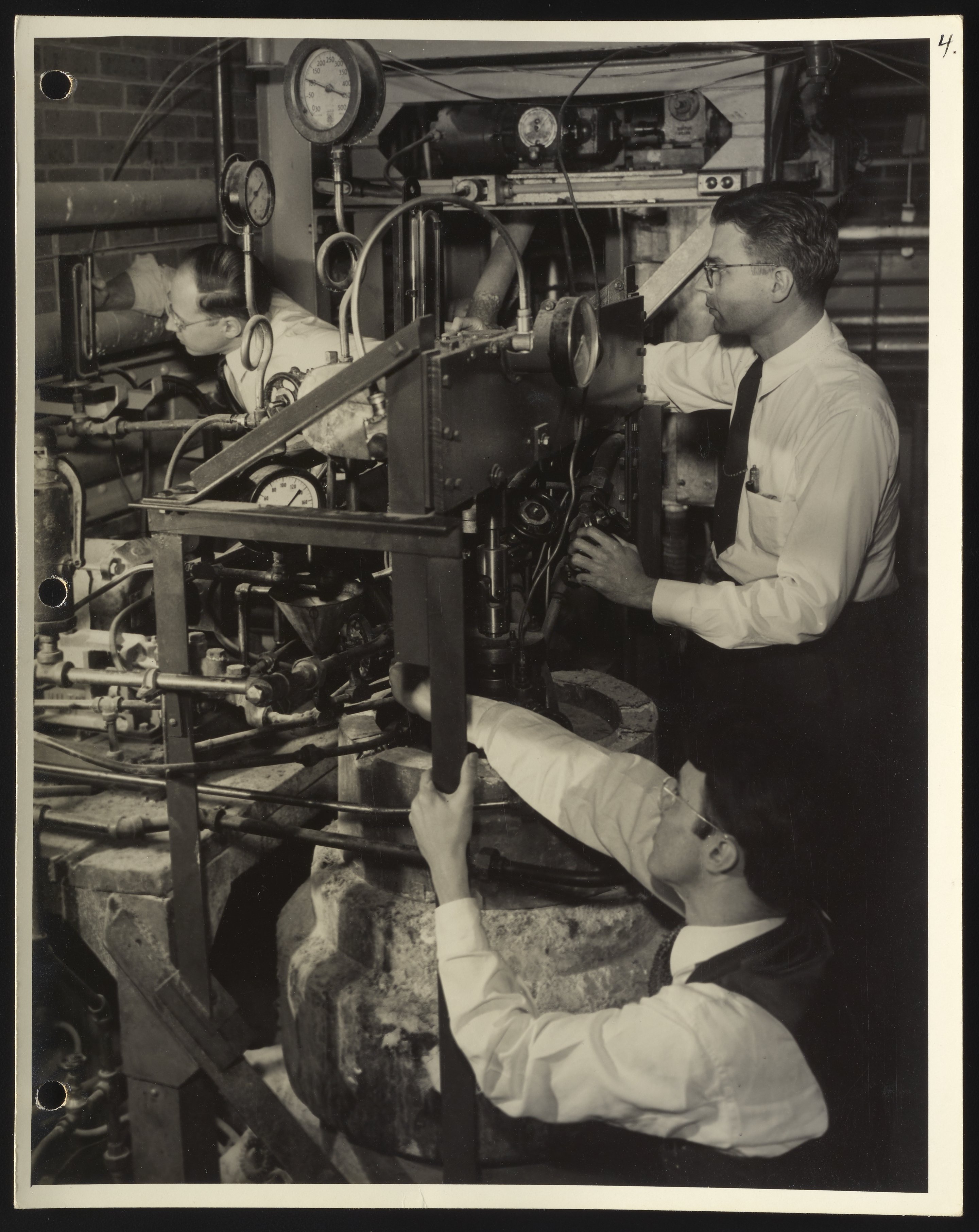 General view of technicians inspecting an autoclave located in the Polymer Wing at a DuPont facility during the early stages of synthetic fiber production and research. The individuals visible in the photograph are identified as follows: J. H. Blomquist (left), O. A. Bredeson (center) and J. E. Waltz (right).
