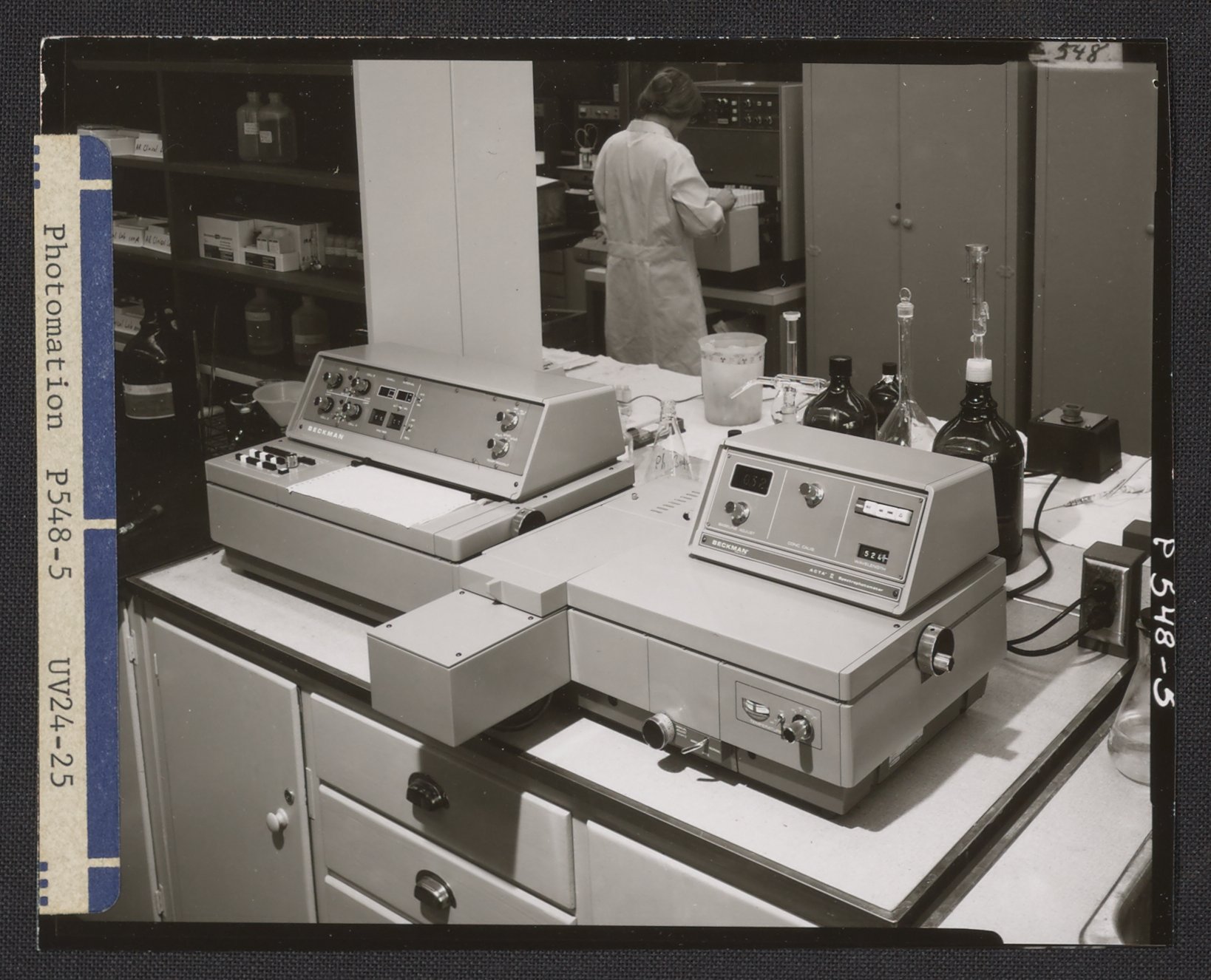 Photomation. “Beckman ACTA C Spectrophotometer on Bench, with a Woman Working with a Laboratory Instrument in the Background,” n.d. Beckman Historical Collection, Box 86. Science History Institute. Philadelphia. https://digital.sciencehistory.org/works/c534fp33h.