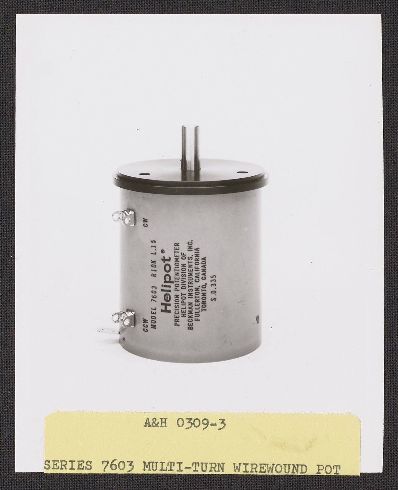 Armstrong & Hess. “Helipot Model 7603 Multi-Turn Wirewound Potentiometer,” 1950–1969. Beckman Historical Collection, Box 85. Science History Institute. Philadelphia. https://digital.sciencehistory.org/works/c534fp37m.
