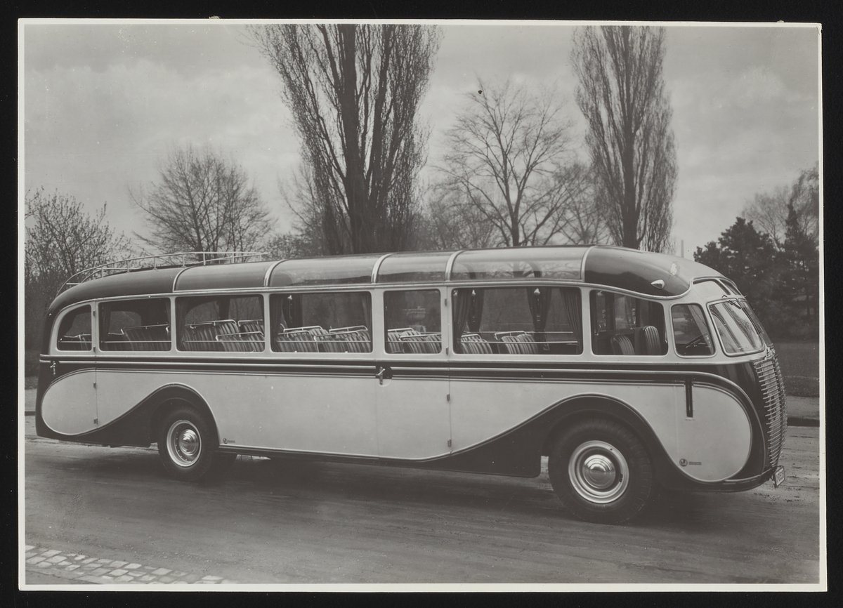 Small JPG1200 x 877px — 150 KBFull-sized JPG2785 x 2035px — 571 KBOriginal fileTIFF — 2785 x 2035px — 16.3 MBFour photographs depicting various German automobiles with Plexiglas windshields and window panels. Per notations accompanying the photographs, the automobiles are identified as follows: 1) Opel Super 6 Spezial-Stromlinienkarosserie; 2) Sportwagen Alfa-Romeo S.E. Benito Mussolini; 3) Stromilinien-Omnibus der Fahrzeugwerke Recklinghausen; 4) Raupenketten-Kraftomnibus Daimler-Benz. Notably, the automobile in the fourth photograph bears a swastika and insignia of the Third Reich.