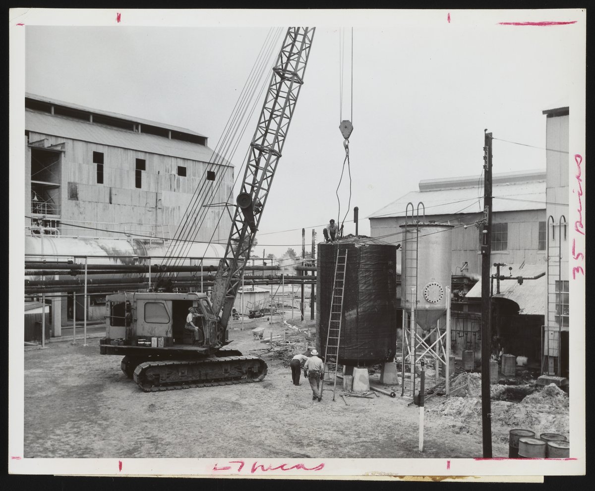 General view of several employees using a crane to move a heat treatment tank in preparation for the expansion of rosin-making facilities at the Hercules Powder Company plant in Brunswick, Georgia. One of two Hercules plants specializing in naval stores, the Brunswick plant extracted rosin, turpentine, and pine oil from pine tree stumps in order to produce a range of chemicals used in the manufacture of varnishes, paints, adhesives, insecticides, textiles, and other industrial products. The employees visible in the photograph are identified as follows: rigger Sidney Dent (beside tank); rigger Robert Ernest Wilchor (bottom of ladder); rigger Edward Gale (on top of tank); and crane operator Houston Hall.