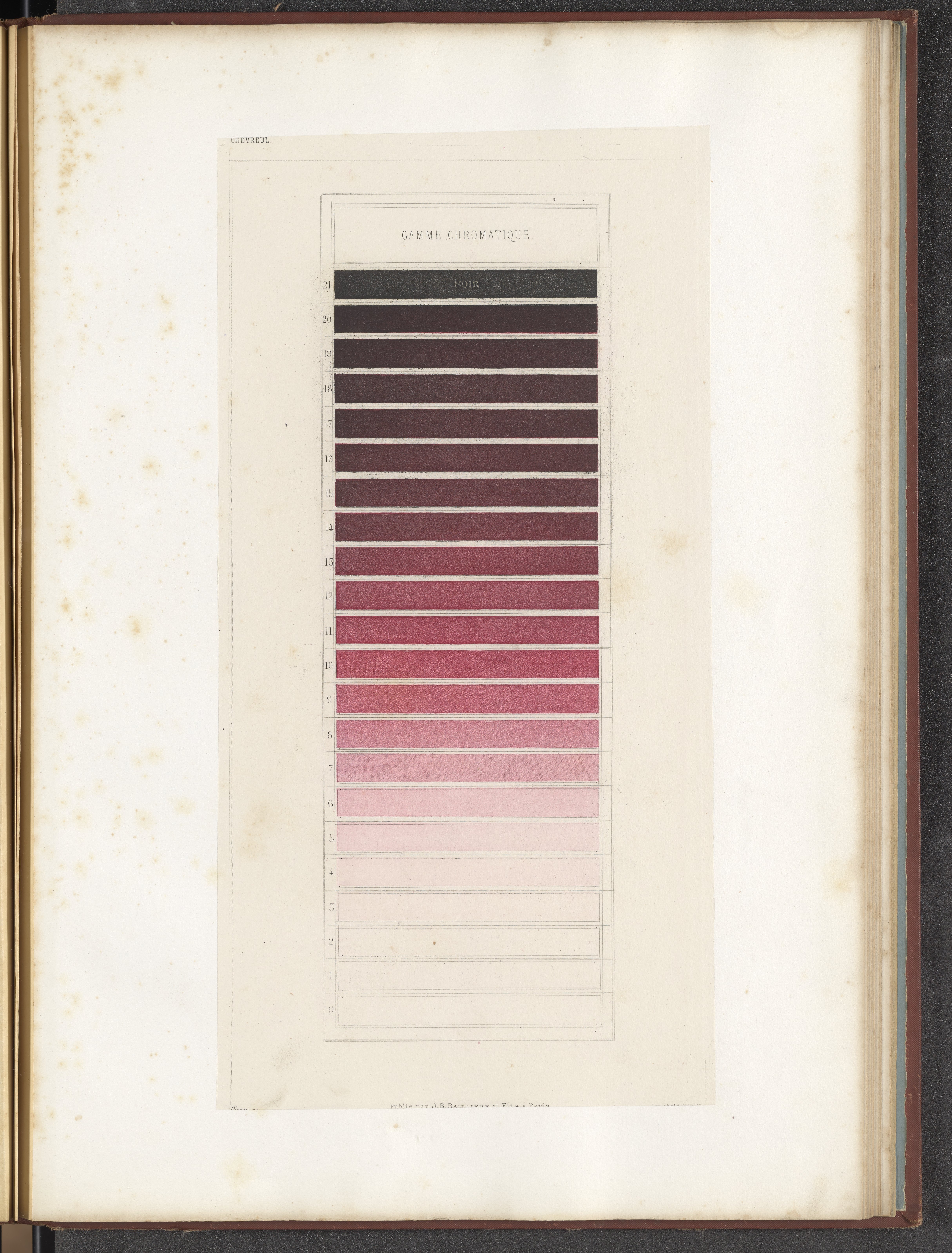 Chevreul, M. E. (Michel Eugène). “Plate XVI: Gamme Chromatique: Rouge.” In Des Couleurs Et De Leurs Applications Aux Arts Industriels à l'Aide Des Cercles Chromatiques. Paris, France: J.-B. Baillière et fils, 1864. https://digital.sciencehistory.org/works/c821gj948.