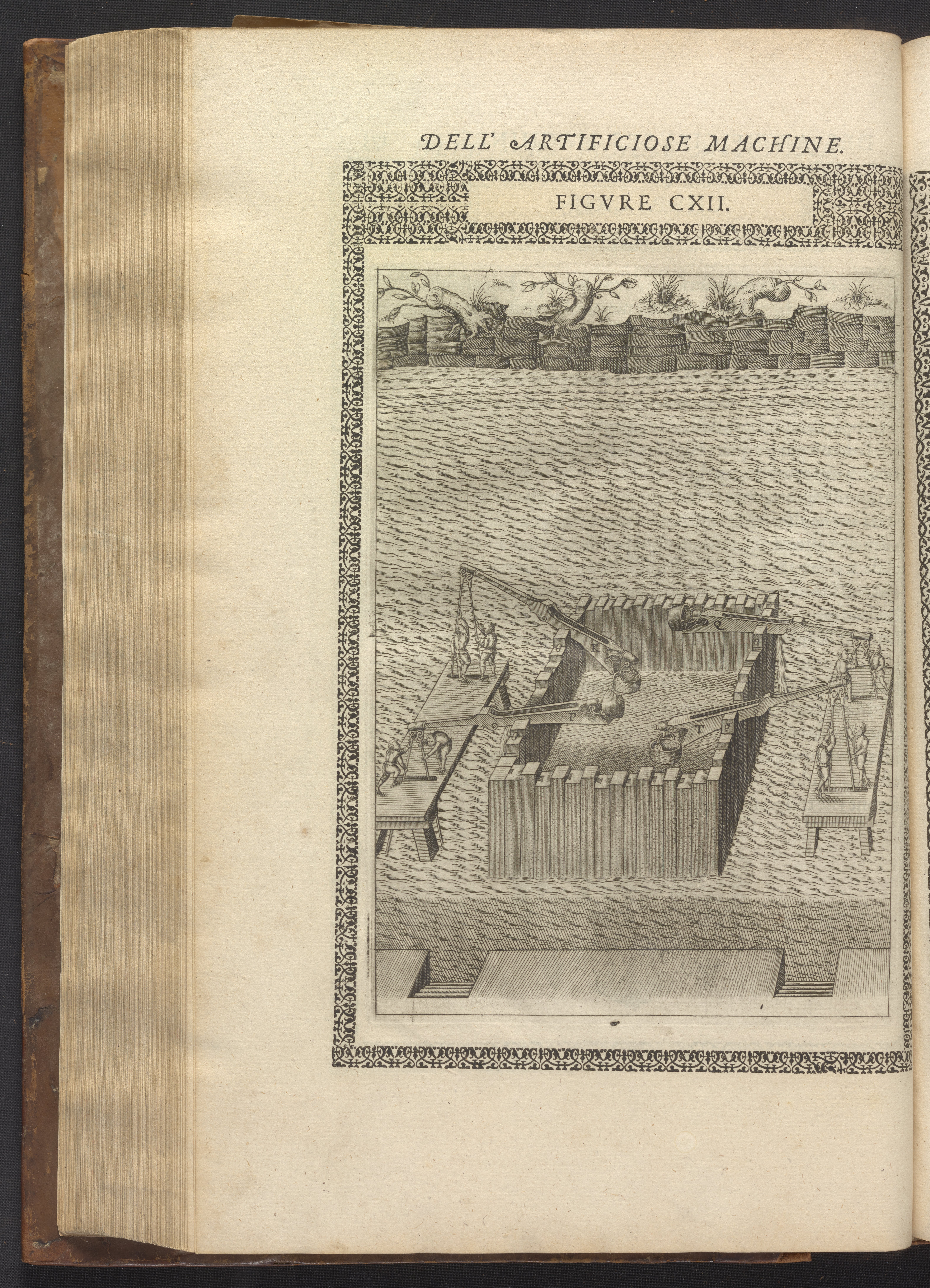Ramelli, Agostino. “Plate 112: Cofferdam Used to Drain Relatively Low Water.” In Le Diverse Et Artificiose Machine Del Capitano Agostino Ramelli. Paris, France, 1588. https://digital.sciencehistory.org/works/c821gj95j.