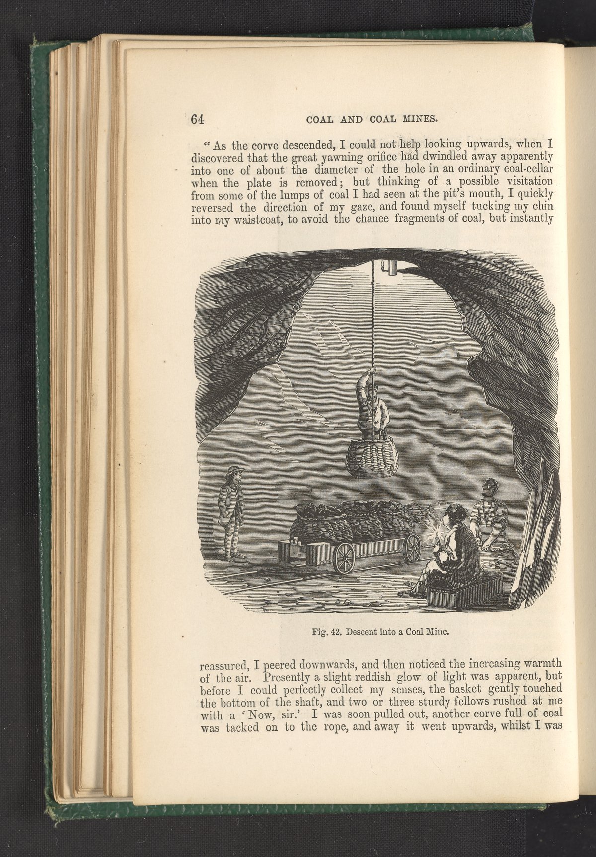 Pepper, John Henry. “Figure 42. Descent into a Coal Mine.” The Playbook of Metals : Including Personal Narratives of Visits to Coal, Lead, Copper, and Tin Mines; with a Large Number of Interesting Experiments Relating to Alchemy and the Chemistry of Fifty Metallic Elements. London, England, 1862. https://digital.sciencehistory.org/works/c83xiss.