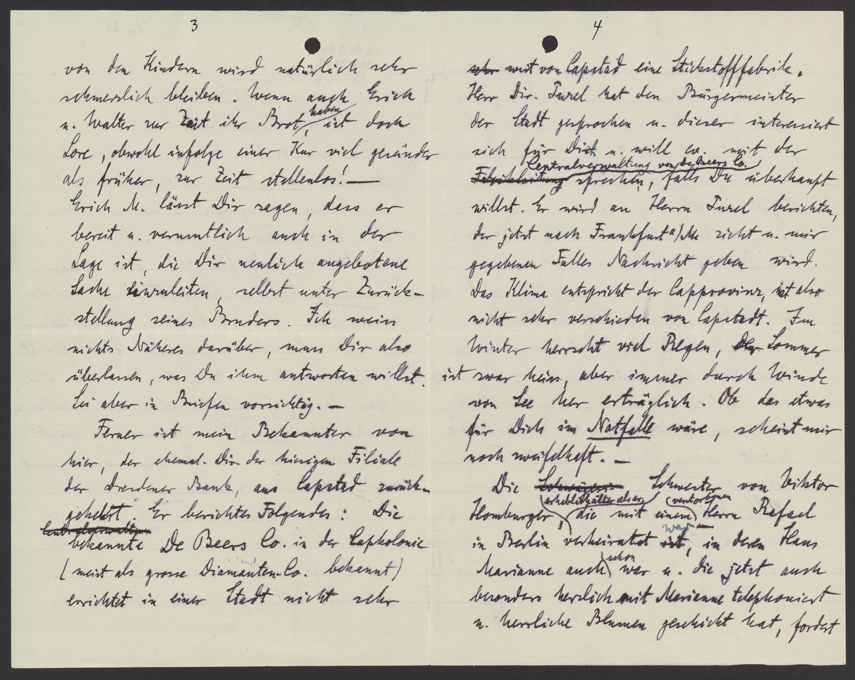 Ferner ist mein Bekannter von hier, der ehemaliger Direktor der hiesigen Filiale der Dresdner Bank, aus Capstad zurückgekehrt. Er berichtete Folgendes: Die bekannte De Beers Co. in der Capkolonie (meist als grosse Diamanten-Co. bekannt) errichtet in einer Stadt nicht sehr