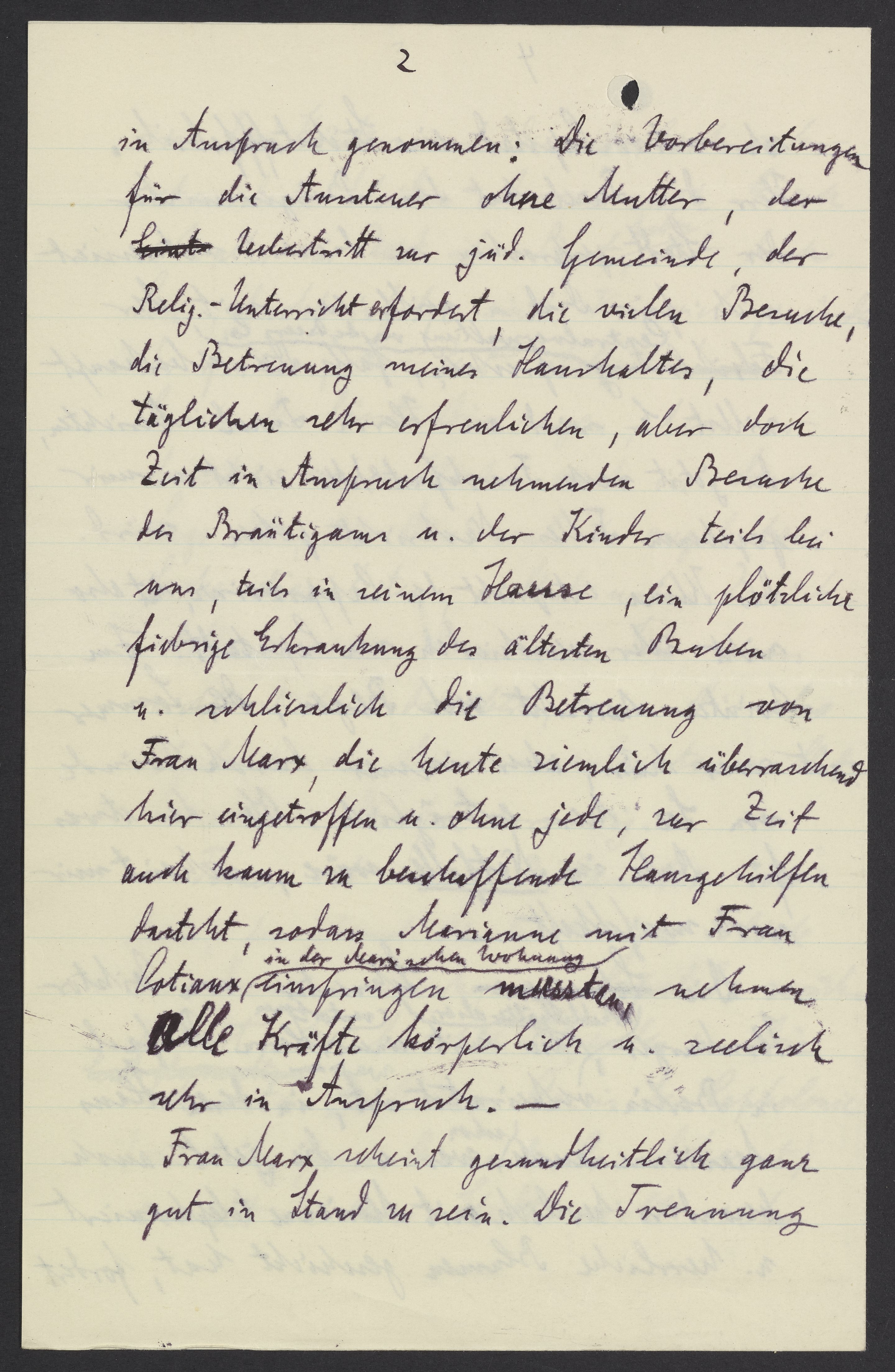 in Anspruch genommen: Die Vorbereitung für die Aussteuer ohne Mutter, der Übertritt zur jüdischen Gemeinde, der Religionsunterreicht erfordert, die vielen Besuche, die Betreuung meines Haushaltes, die täglichen sehr erfreulichen, aber doch Zeit in Anspruch nehmenden Besuche der Bräutigame u. der Kinder teils bei uns, teils in seinem Hause, eine plötzliche fiebrige Erkrankung des älteren Buben u. schliesslich die Betreuung von Frau Marx, die heute ziemlich überraschend hier eingetroffen u. ohne jede, zur Zeit auch kaum zu beschaffende Hausgehilfin dasteht, sodass Marianne mit Frau Cotiaux in der Marxschen Wohnung einspringen mussten nehmen alle Kräfte körperlich u. seelisch sehr in Anspruch.