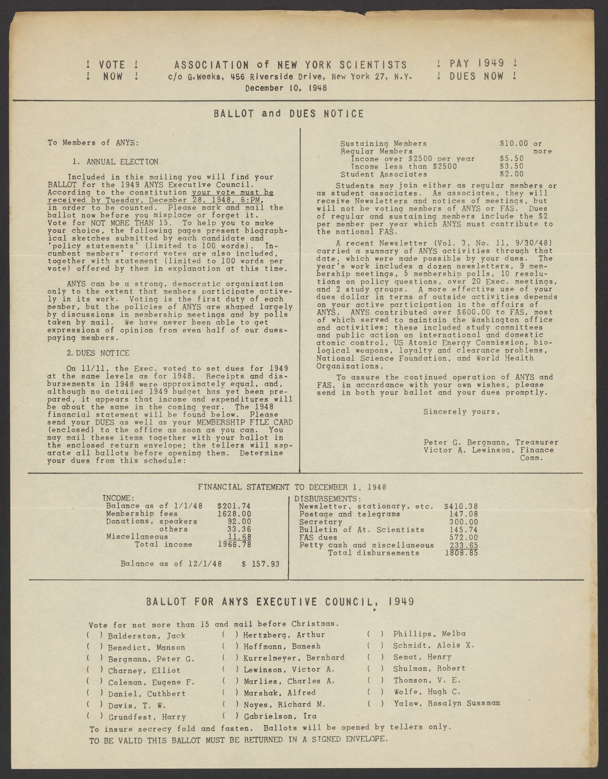 Association of New York Scientists. “Ballot and Dues Notice from the Association of New York Scientists,” December 10, 1948. Papers of Georg and Max Bredig, Box 10, Folder 3. Science History Institute. Philadelphia. https://digital.sciencehistory.org/works/c8k4exo.