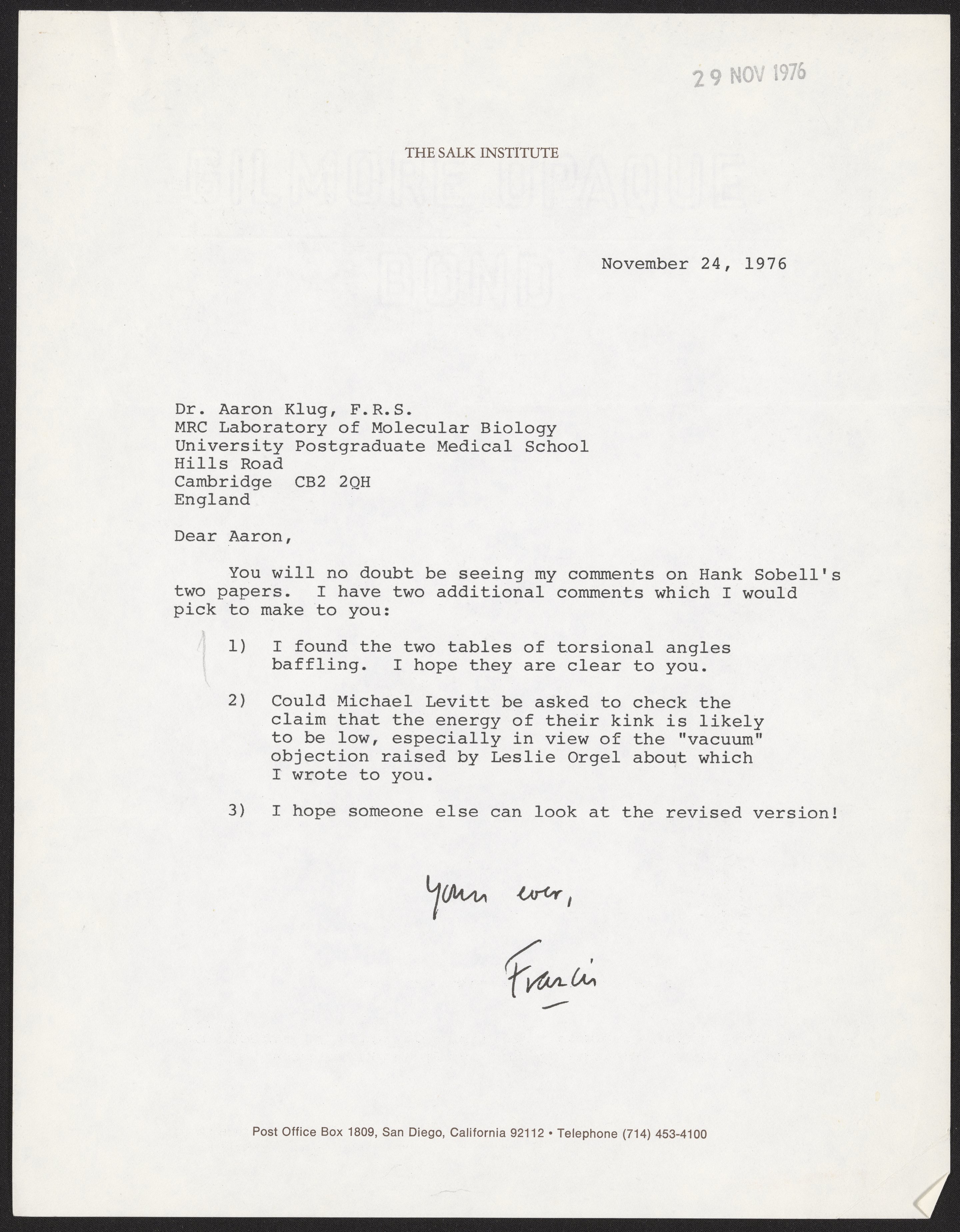 Letter from Francis Crick to Aaron Klug, November 24, 1976