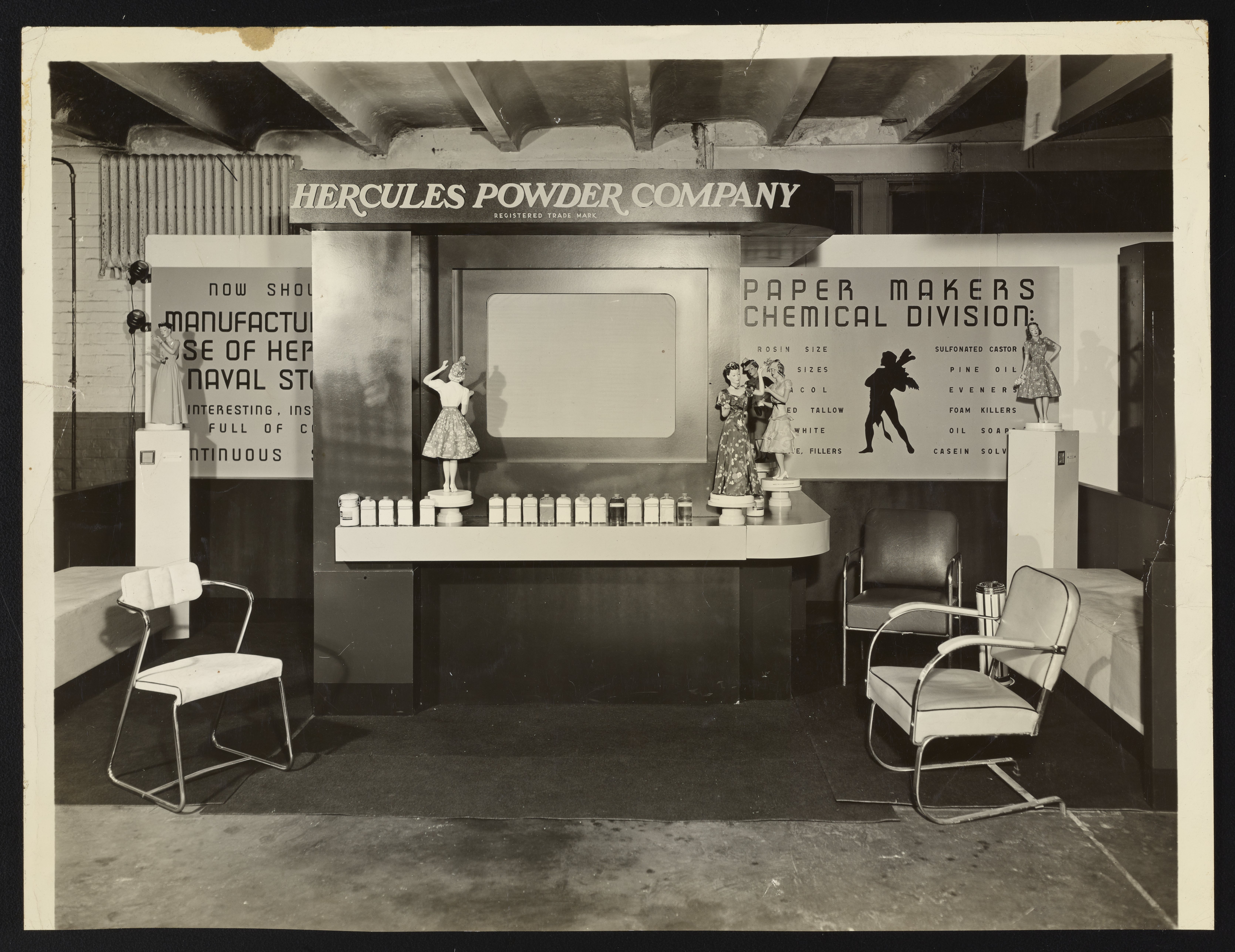 General view of an exhibition display advertising the products of the Hercules Powder Company's Paper Makers Chemical Division.
