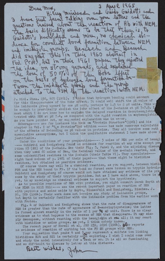 Edsall, John T. (John Tileston). “Letter from John T. Edsall to Max Perutz, April 3, 1965,” April 3, 1965. History of Molecular Biology Collection, Box 74, Folder 12. Science History Institute. Philadelphia. https://digital.sciencehistory.org/works/calru91.