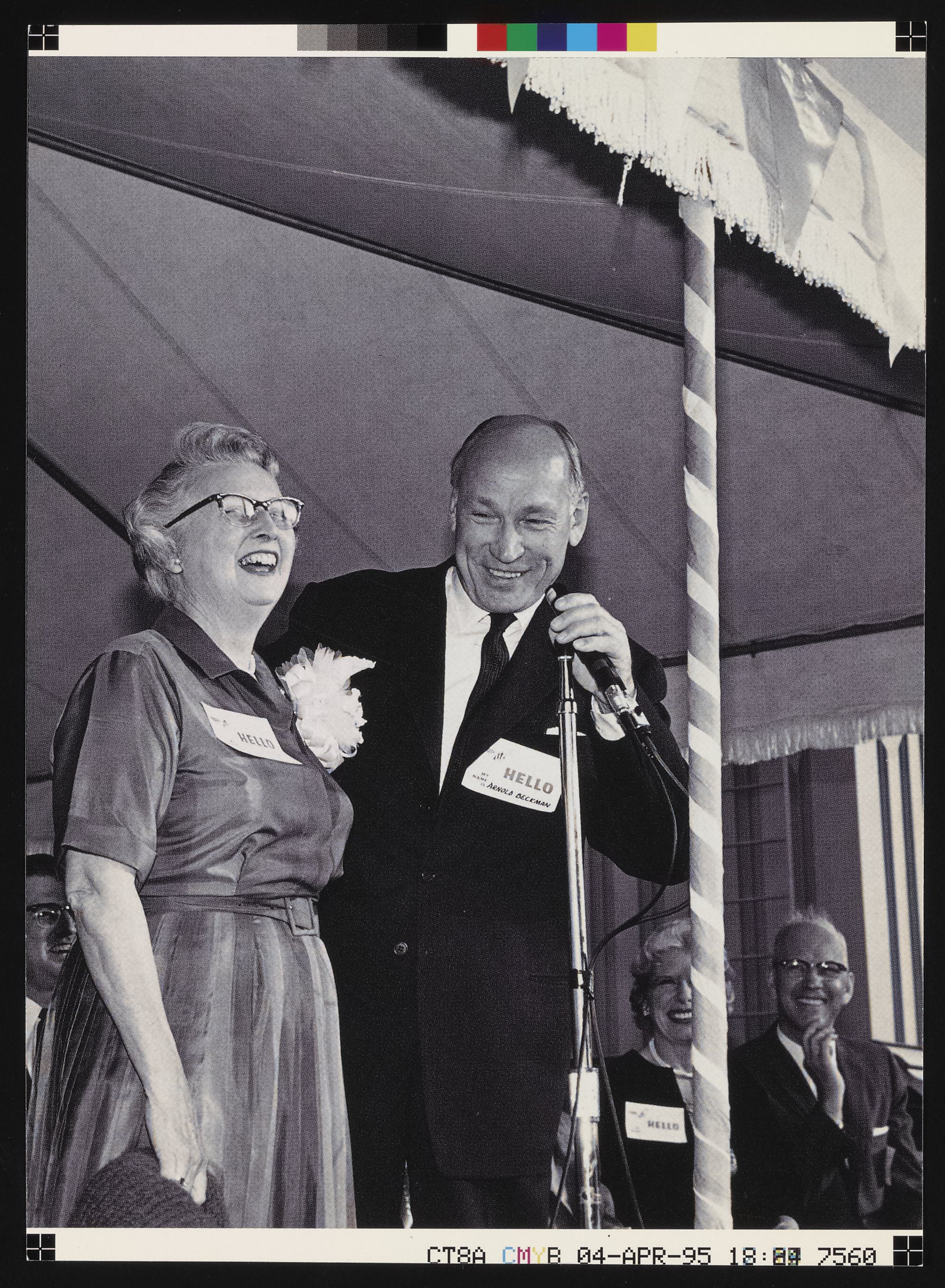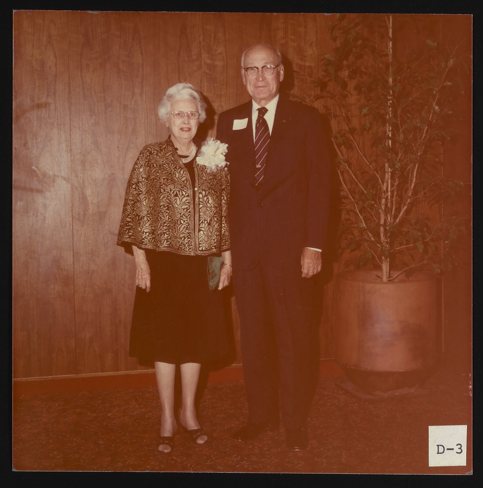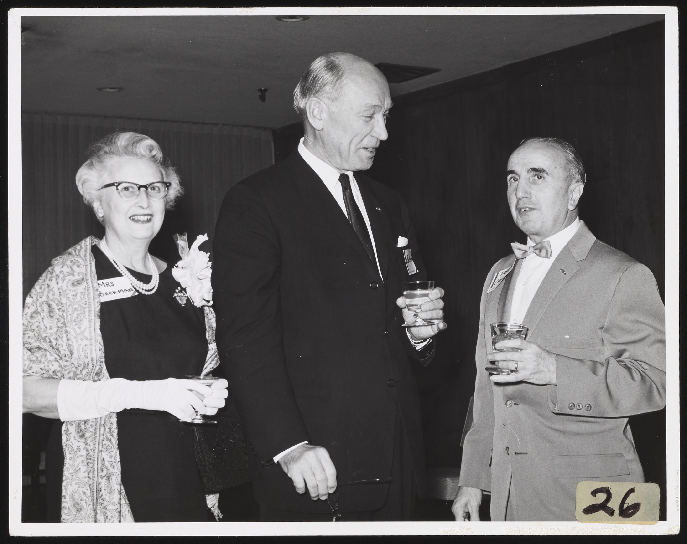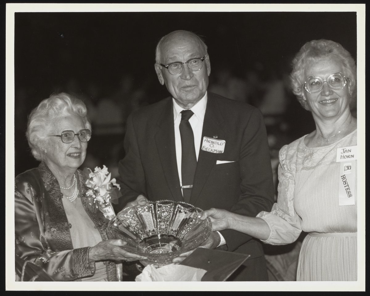 Small JPG1200 x 979px — 76.3 KBLarge JPG2880 x 2350px — 345 KBFull-sized JPG3188 x 2601px — 412 KBOriginal fileTIFF — 3188 x 2601px — 23.8 MBThis selection of photographs depicts Arnold and Mabel Beckman at their home and attending various events. Some are dated, and all appear to fall into the period between the 1940s and 1985, when the couple was presented with a crystal bowl in honor of their sixtieth wedding anniversary. Many photographs bear volume or identifying numbers of unclear significance; most are unattributed. In addition to the Beckmans, Frank Camarda, Howard Teeter, and Jan Horn are identified.