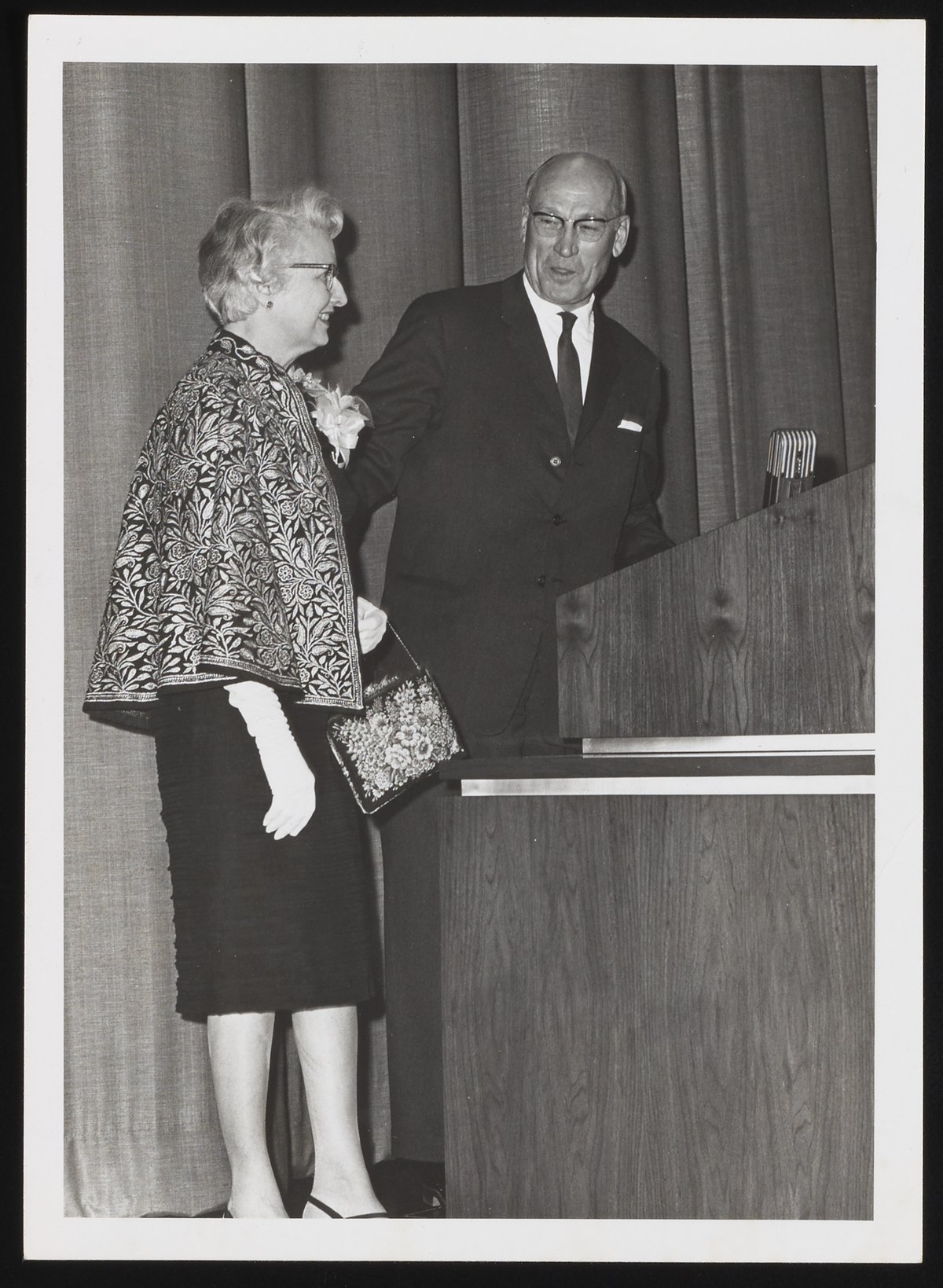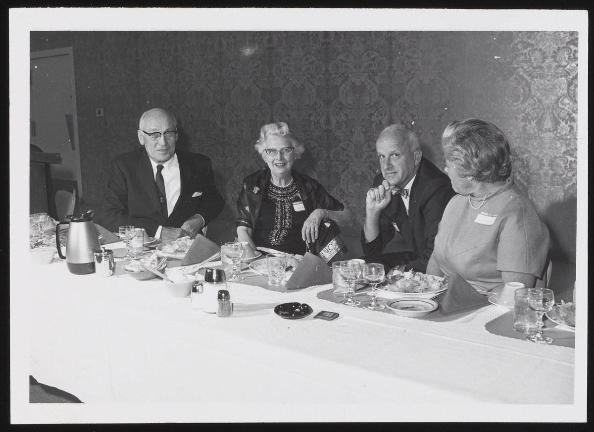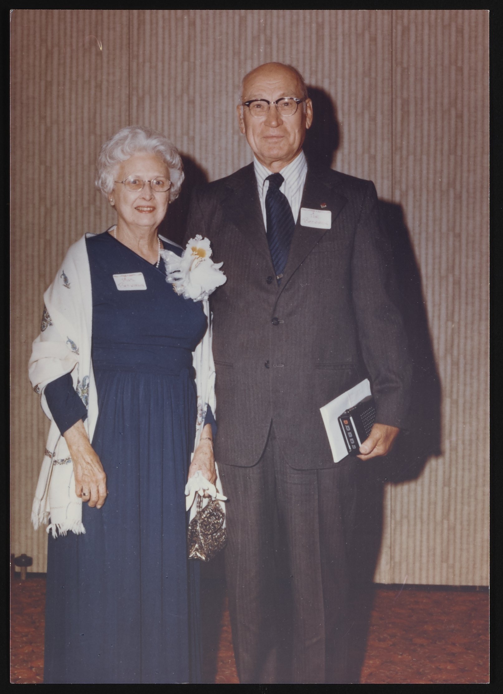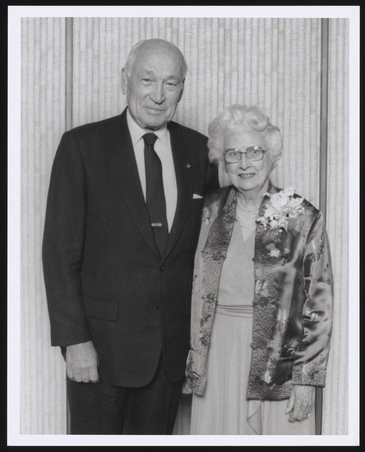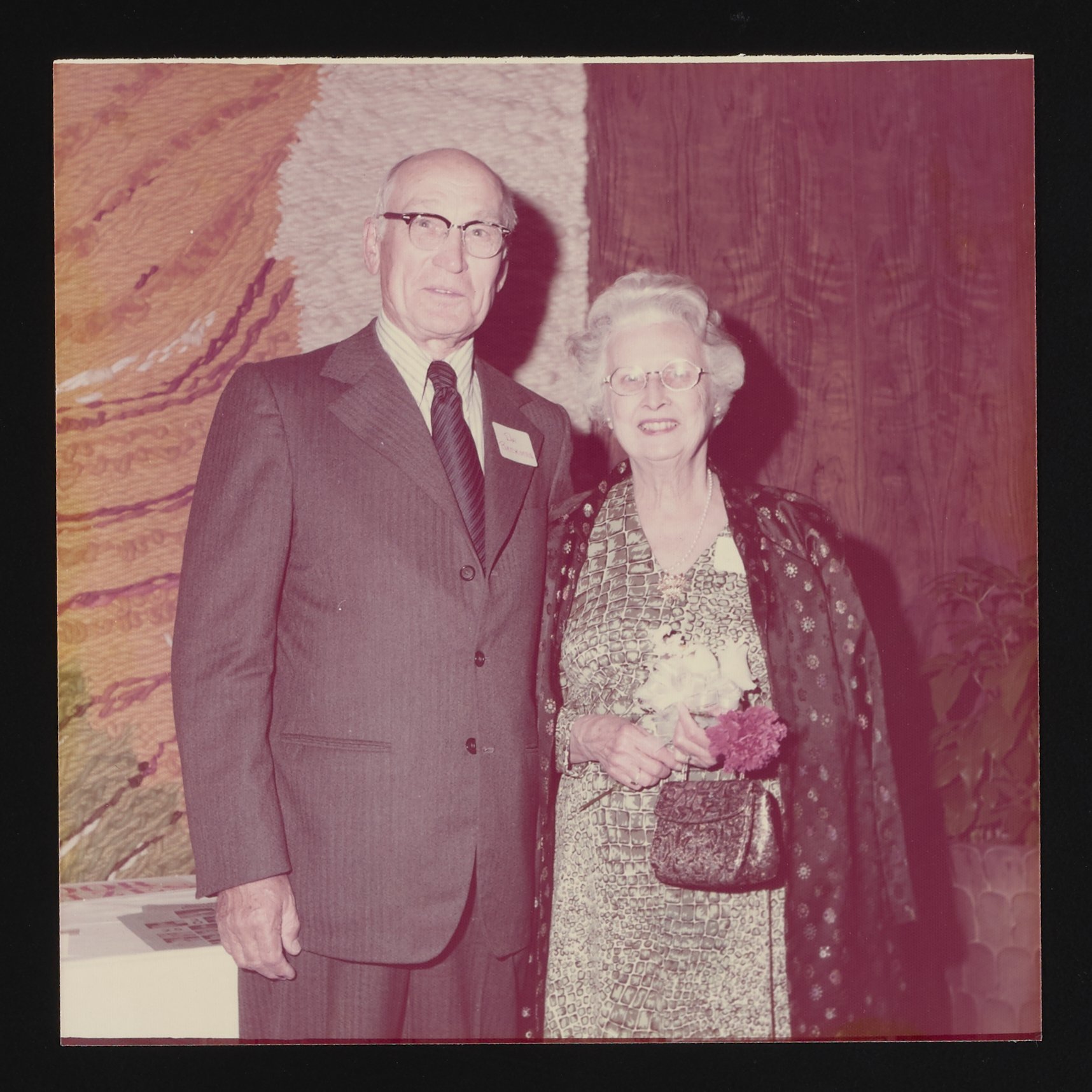 Small JPG1200 x 979px — 76.3 KBLarge JPG2880 x 2350px — 345 KBFull-sized JPG3188 x 2601px — 412 KBOriginal fileTIFF — 3188 x 2601px — 23.8 MBThis selection of photographs depicts Arnold and Mabel Beckman at their home and attending various events. Some are dated, and all appear to fall into the period between the 1940s and 1985, when the couple was presented with a crystal bowl in honor of their sixtieth wedding anniversary. Many photographs bear volume or identifying numbers of unclear significance; most are unattributed. In addition to the Beckmans, Frank Camarda, Howard Teeter, and Jan Horn are identified.