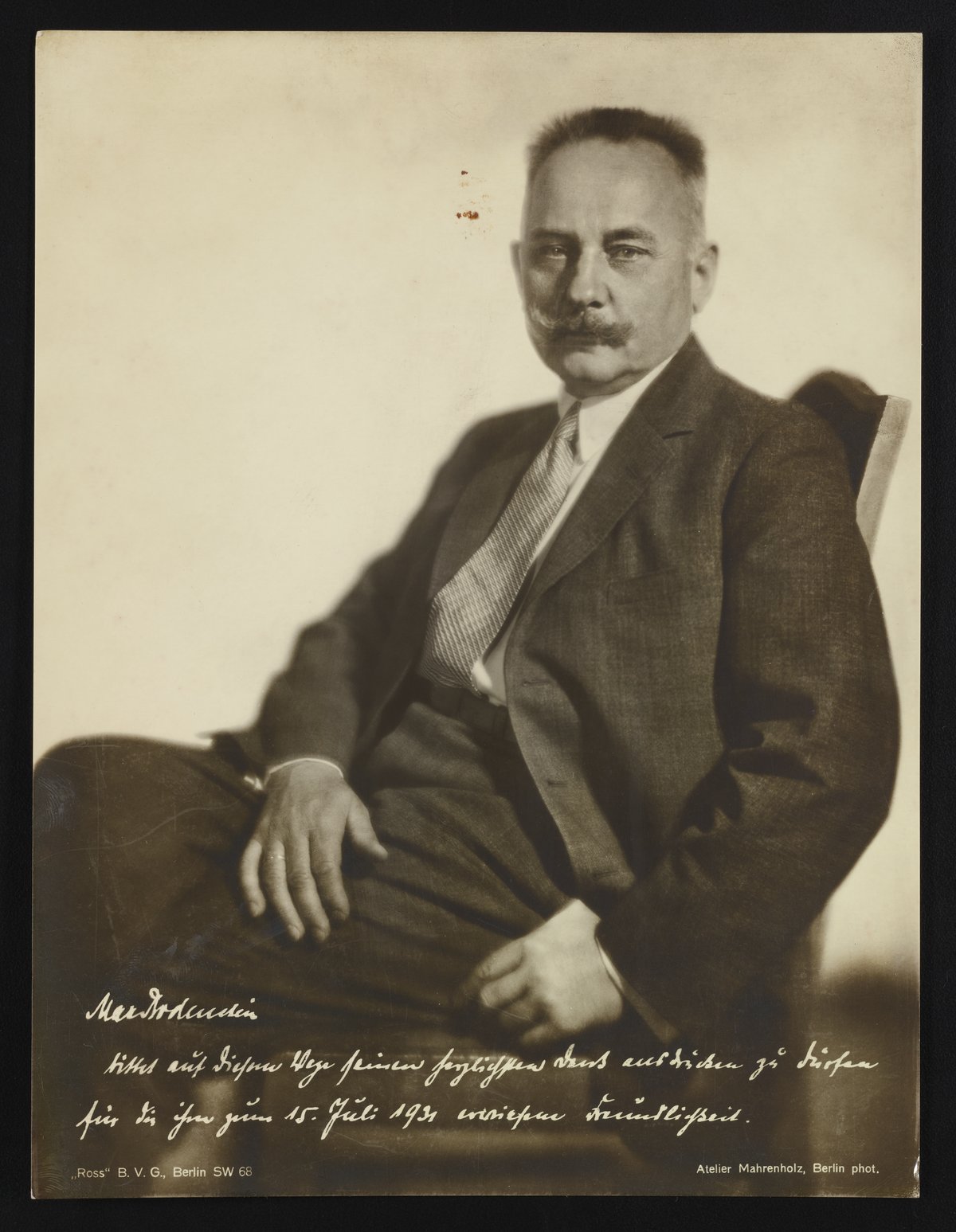 Black and white portrait of Max Bodenstein (1871-1942). Bodenstein has written a thank you note across the bottom of the photograph.