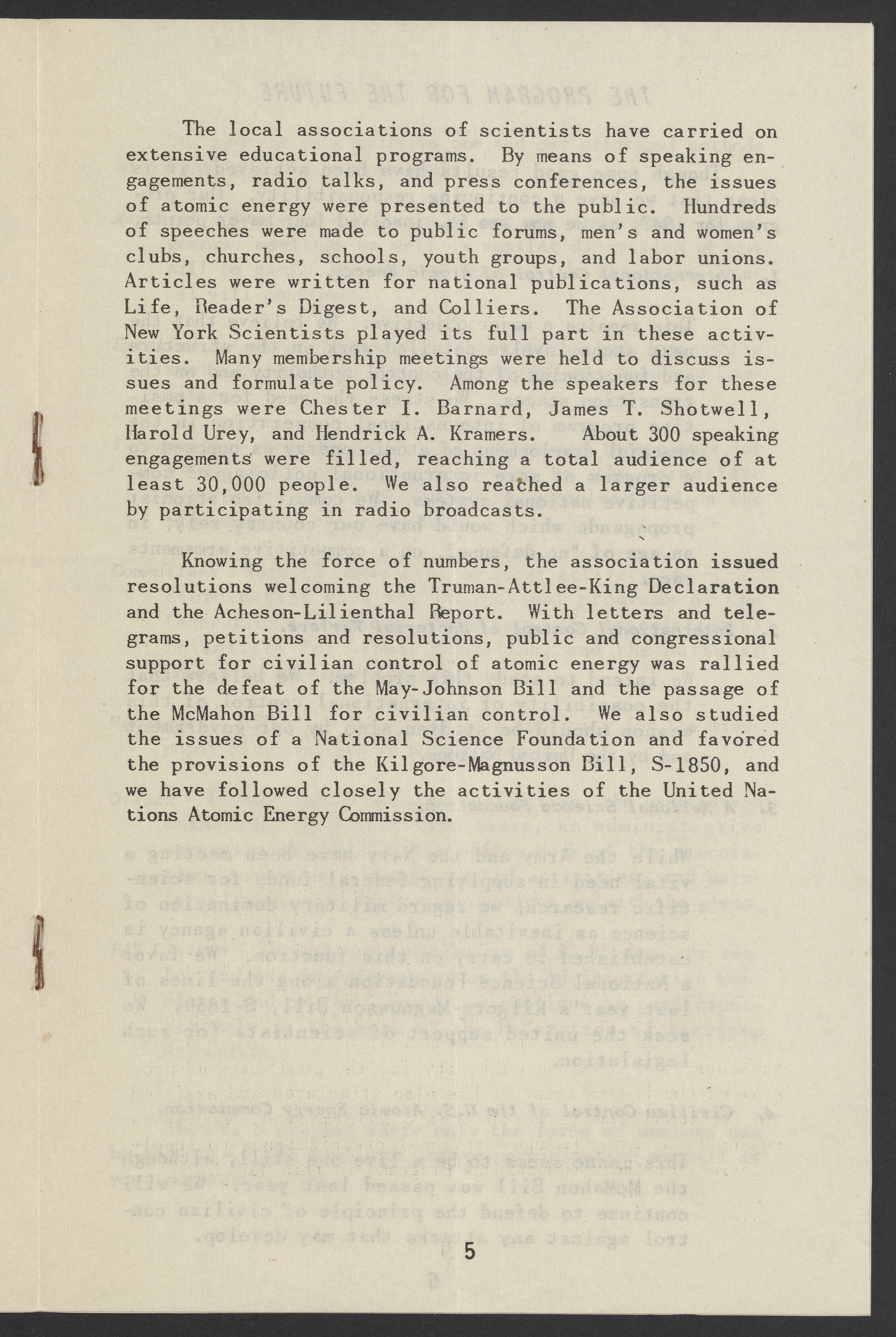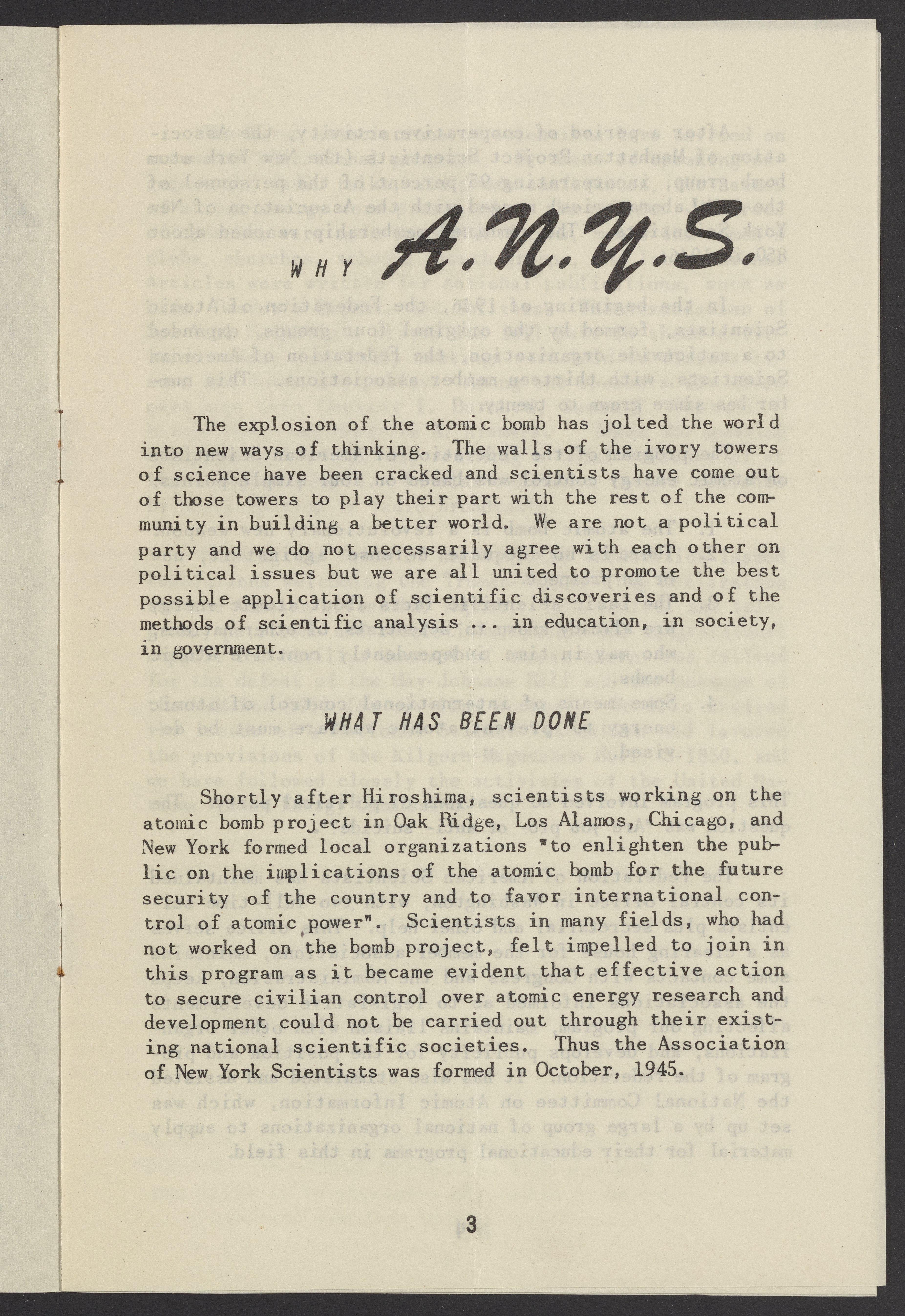 Small JPG1200 x 1825px — 280 KBLarge JPG2880 x 4380px — 1.7 MBFull-sized JPG3543 x 5388px — 2.5 MBOriginal fileTIFF — 3543 x 5388px — 54.7 MB1947 newsletter for the Association of New York Scientists (ANYS). The newsletter discusses the association's purpose and goals. ANYS believed in international control of atomic energy and bacterial warfare, a national science foundation, and civilian control of the United States Atomic Energy Commission.