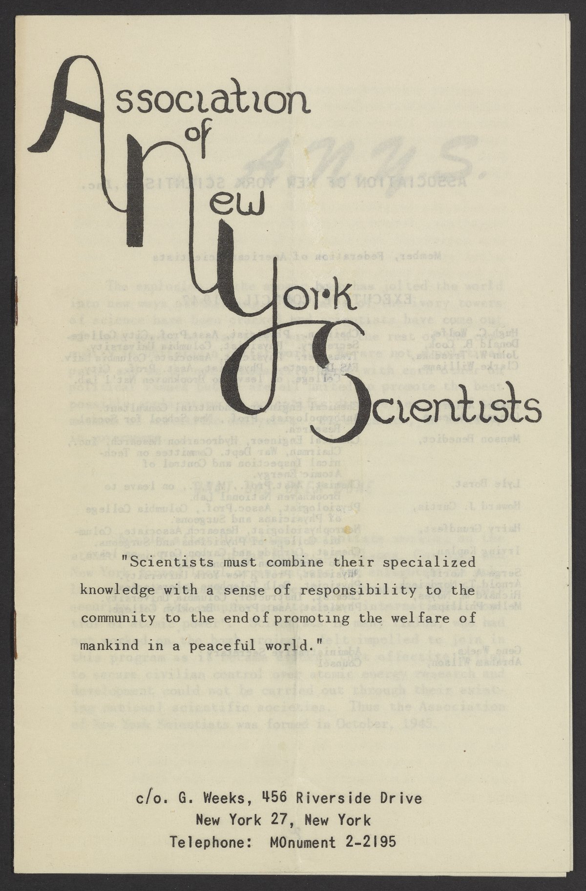 Association of New York Scientists. “Association of New York Scientists 1947 Newsletter,” 1947. Papers of Georg and Max Bredig, Box 10, Folder 3. Science History Institute. Philadelphia. https://digital.sciencehistory.org/works/cdpoepk.