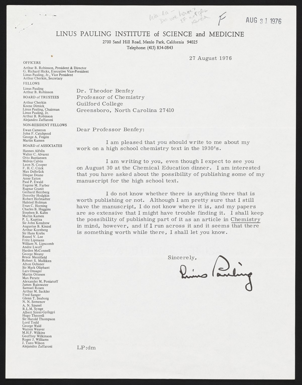 Pauling, Linus. “Letter from Linus Pauling to Theodor Benfey,” August 27, 1976. Benfey Autographed Letter Collection, Box 1. Science History Institute. Philadelphia. https://digital.sciencehistory.org/works/cf95jb452.