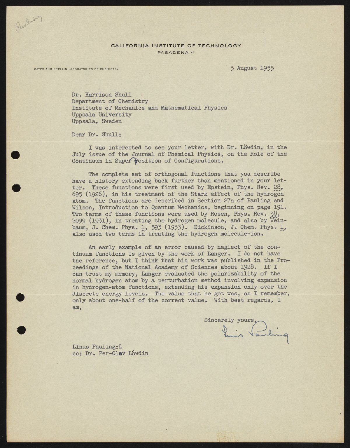 Pauling, Linus. “Letter from Linus Pauling to Harrison Shull, 1955,” August 3, 1955. Robert S. Mulliken & Harrison Shull Correspondence, Box 1. Science History Institute. Philadelphia. https://digital.sciencehistory.org/works/cf95jb495.
