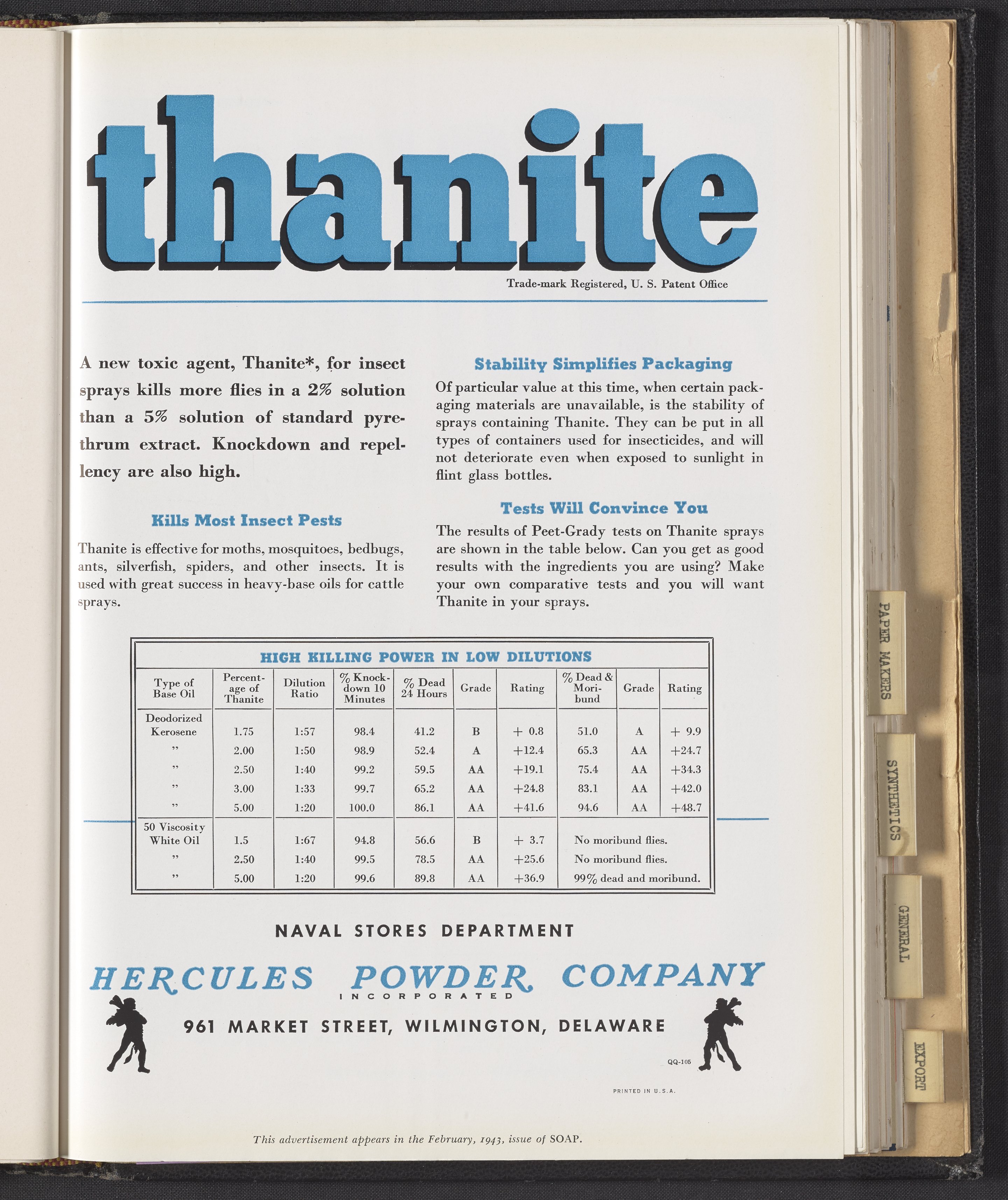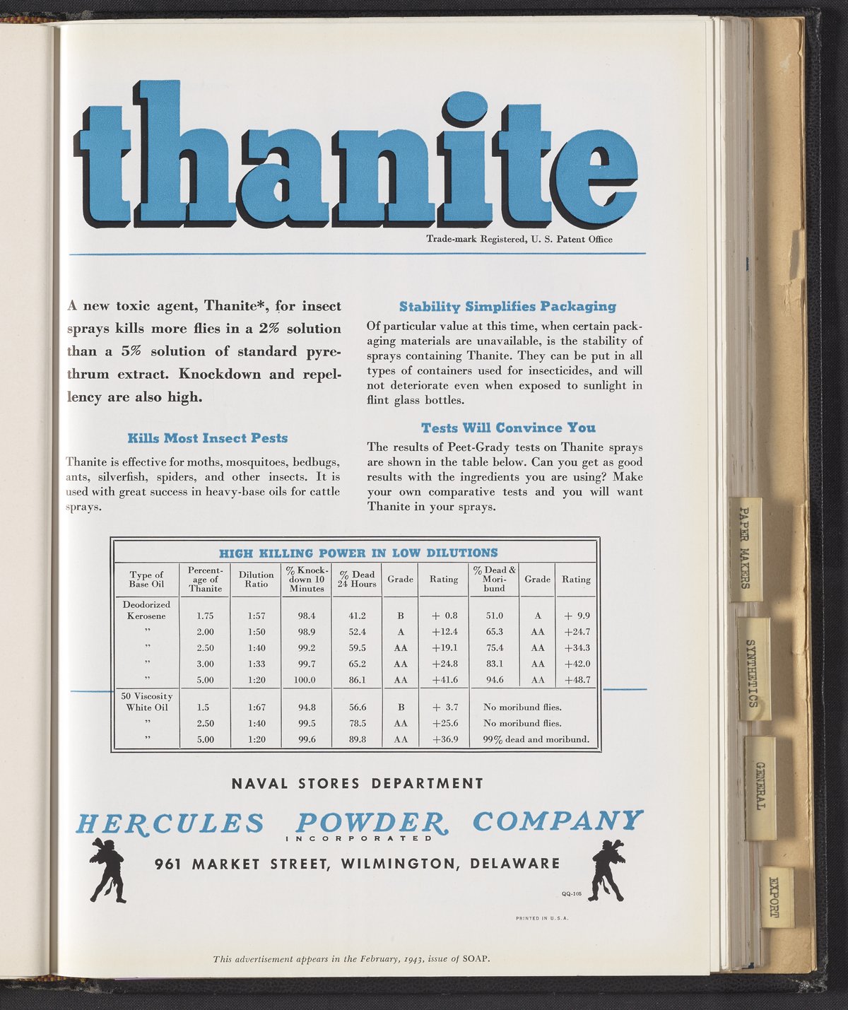 Advertisement for Thanite, a toxicant manufactured and sold by the Hercules Powder Company for use in pesticides and insecticides. This advertisement appeared in the February 1943 issue of Soap.