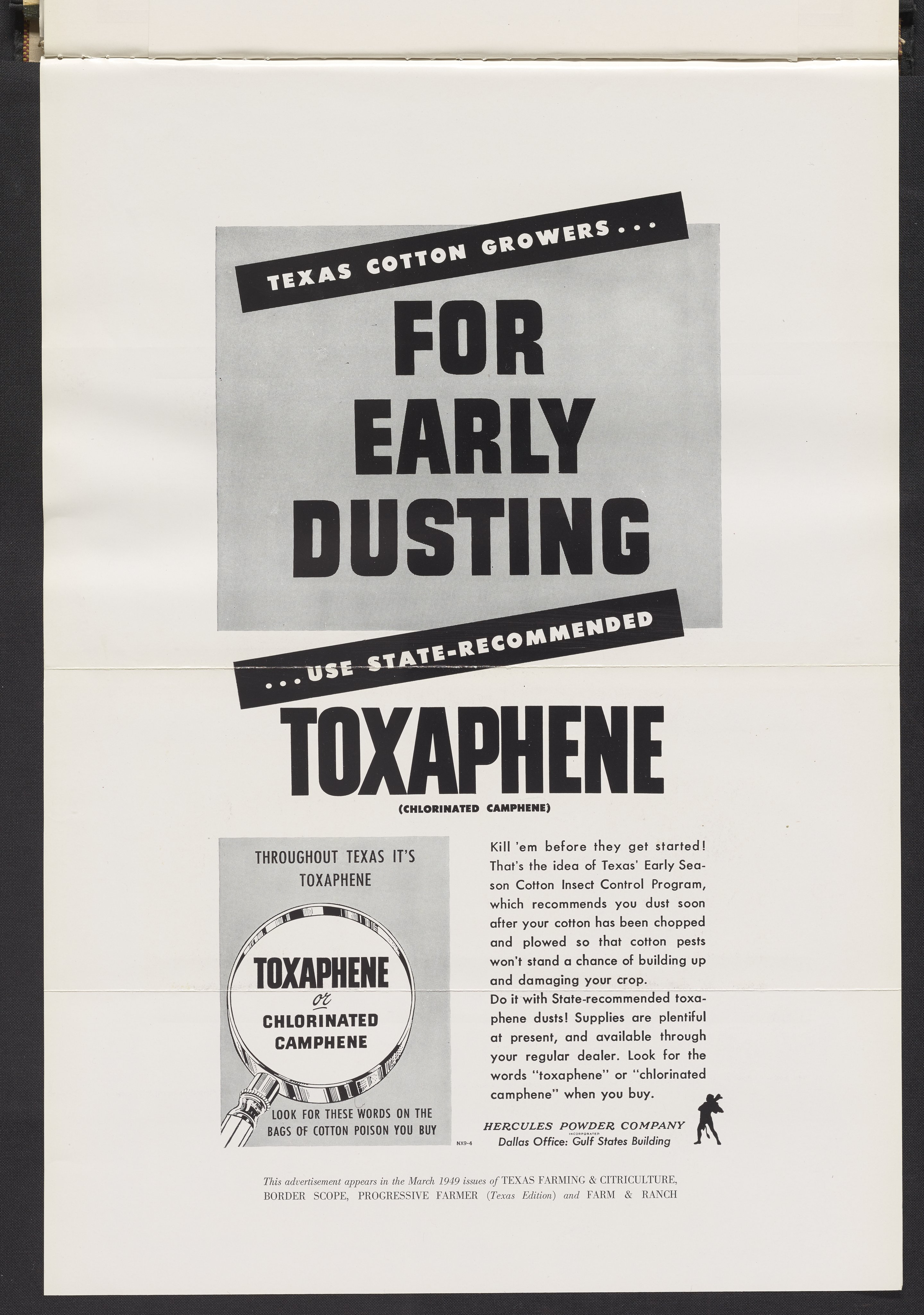 Hercules Incorporated. “Texas Cotton Growers...For Early Dusting...Use State-Recommended Toxaphene.” 1949 Hercules Advertisements, 1949. Records of Hercules Incorporated, Volume 1949. Science History Institute. Philadelphia. https://digital.sciencehistory.org/works/cf95jc33g.