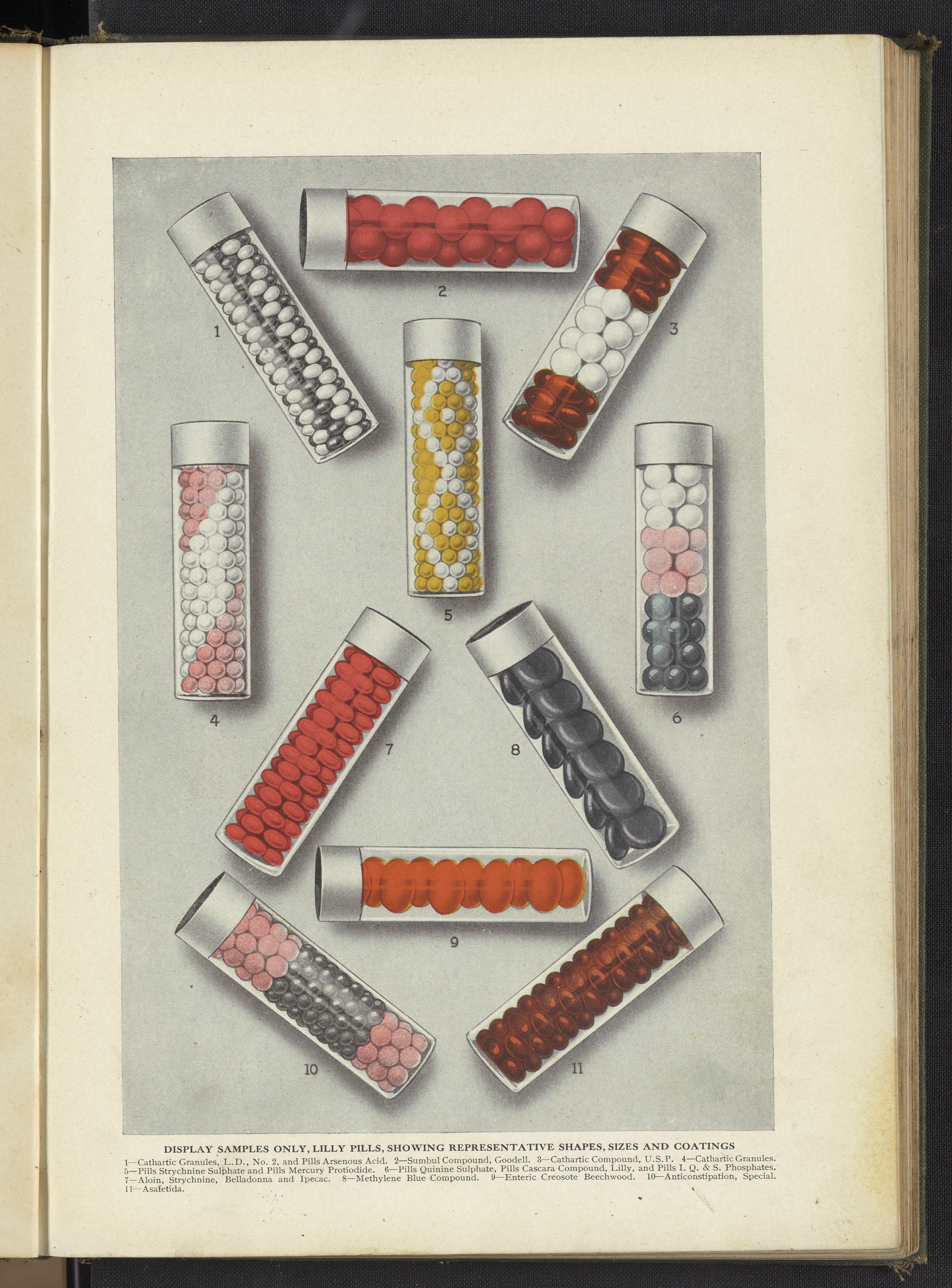 Eli Lilly and Company. “Display Samples Only, Lilly Pills, Showing Representative Shapes, Sizes and Coatings.” Hand Book of Pharmacy and Therapeutics. Indianapolis, Indiana, circa 1919. https://digital.sciencehistory.org/works/cf95jc80v.