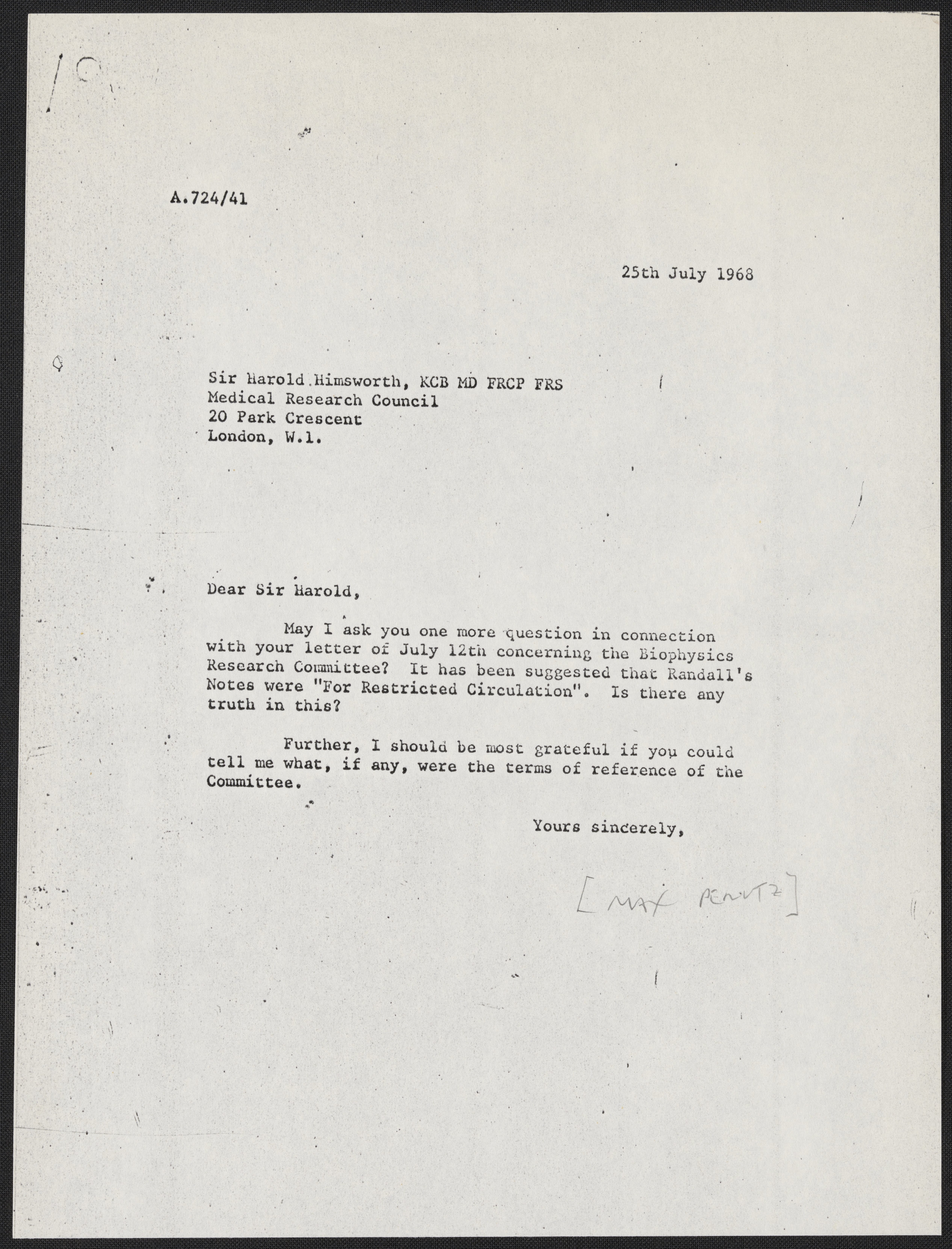 Letter from Max Perutz to Sir Harold Himsworth, July 25, 1968