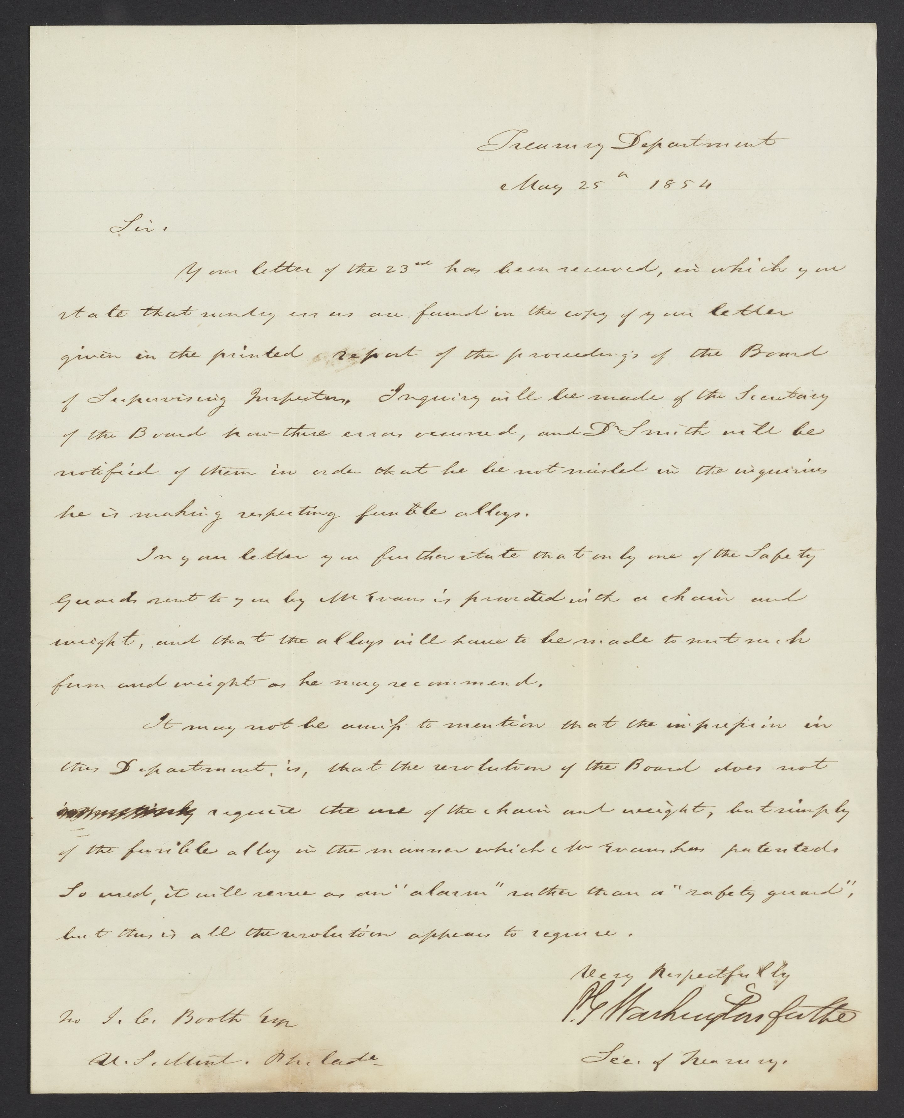 Small JPG1200 x 1484px — 206 KBLarge JPG2880 x 3562px — 978 KBFull-sized JPG3348 x 4141px — 1.2 MBOriginal fileTIFF — 3348 x 4141px — 39.7 MBJames B. Guthrie (1792 - 1869), United States Secretary of the Treasury from 1853-1857, responds to James Curtis Booth's (1810-1888) reported errors in the printed version of his report and problems with two of the three Evans Safety Guards.