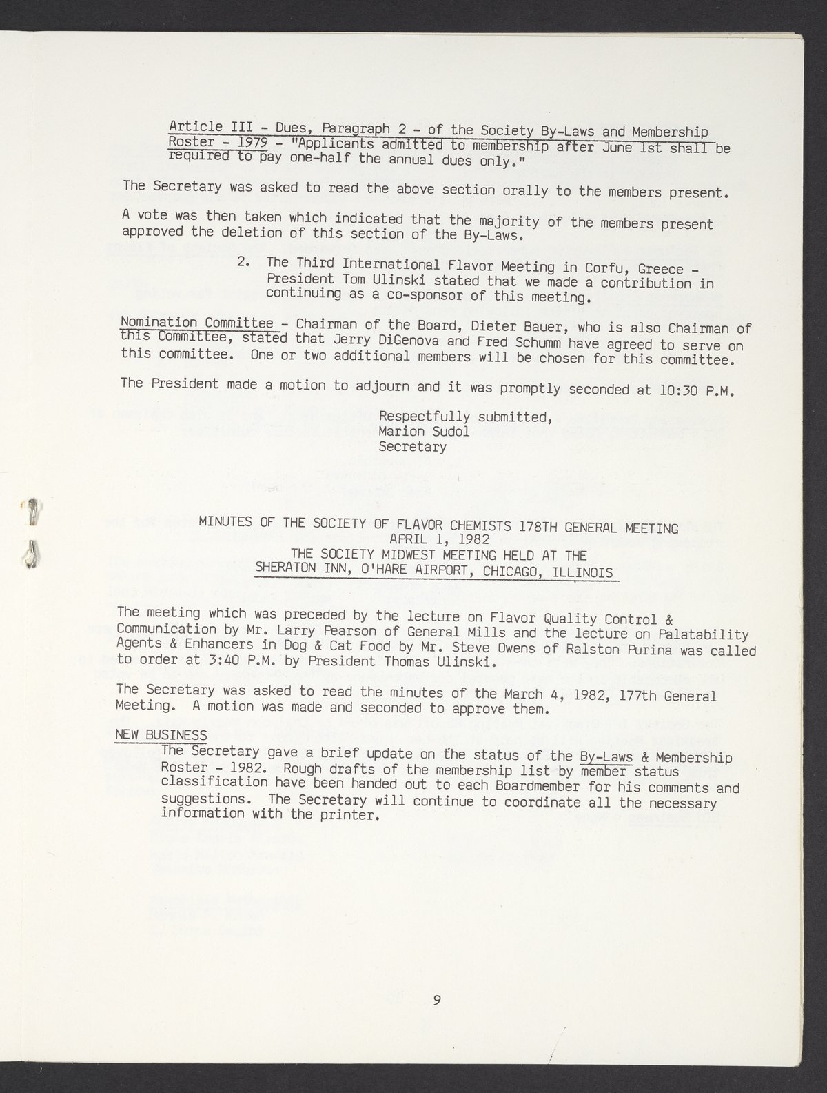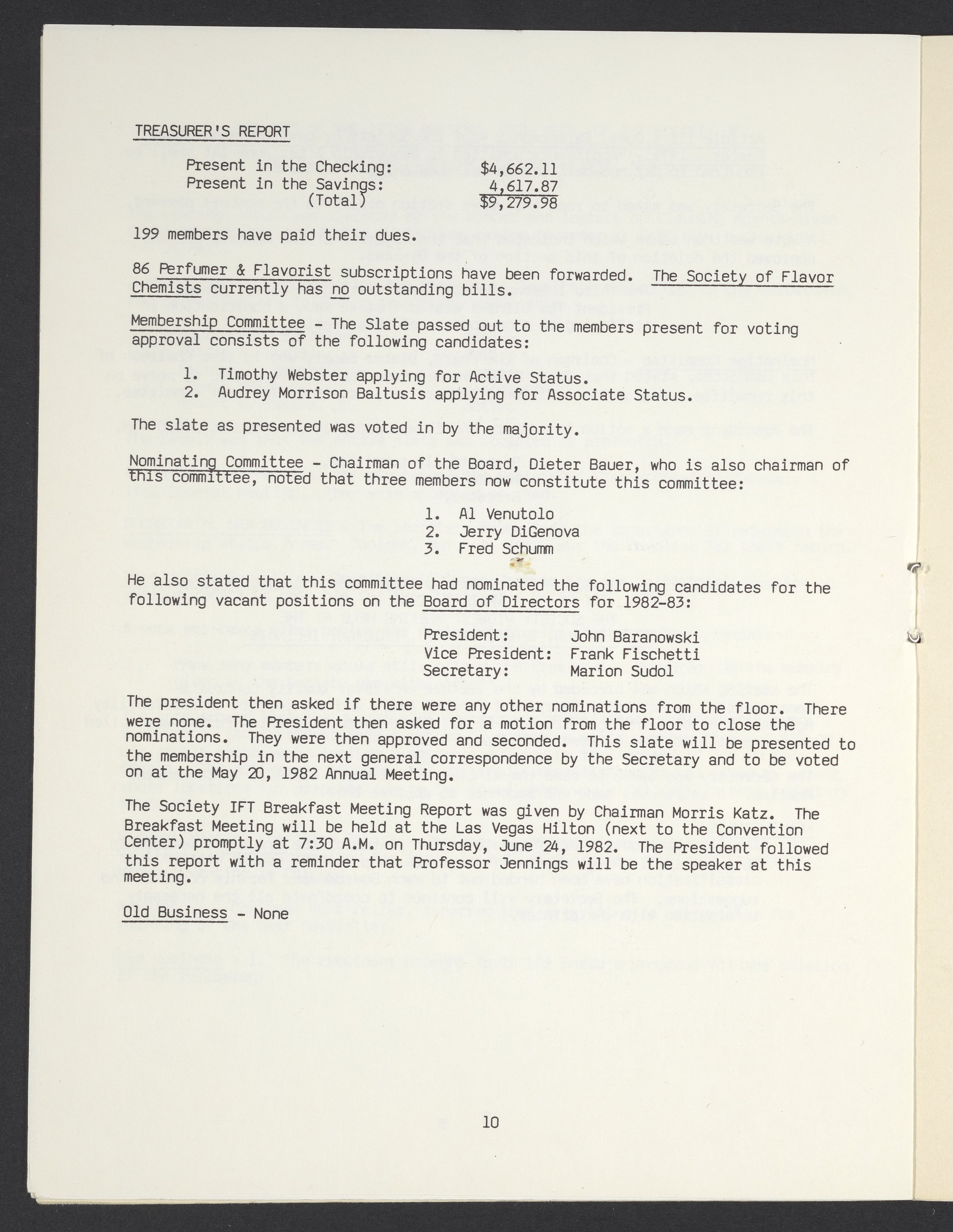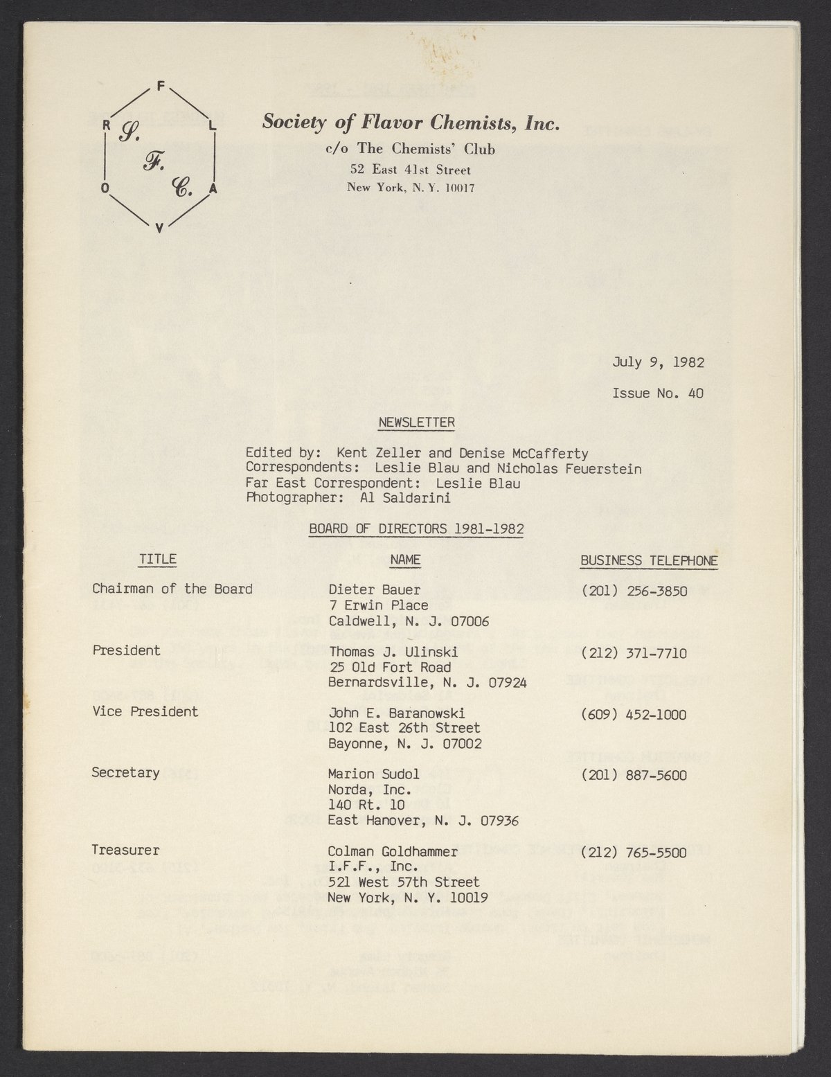 Society of Flavor Chemists. “Society of Flavor Chemists Newsletter, July 1982,” July 9, 1982. Society of Flavor Chemists Newsletters and Certificate of Incorporation, Box 1, Folder 1. Science History Institute. Philadelphia. https://digital.sciencehistory.org/works/cj05h6r.