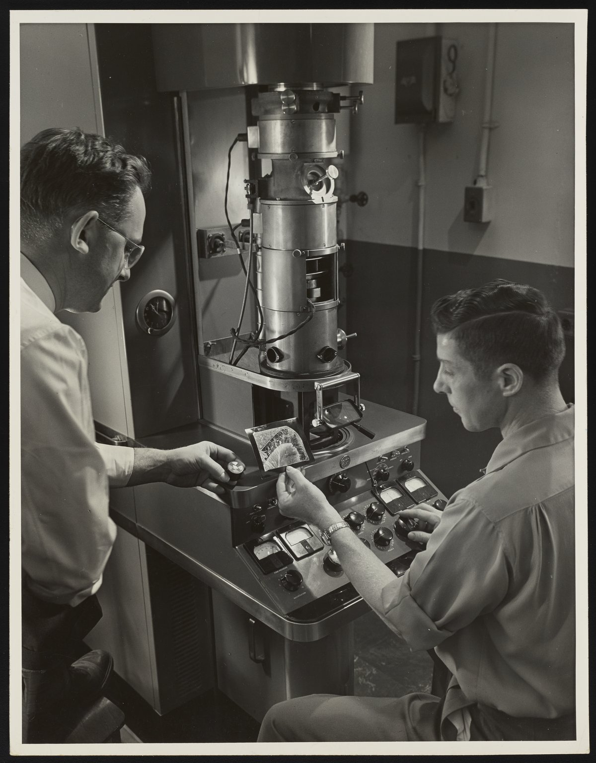 Dow Chemical Company. “RCA Model EMU Electron Microscope in Dow Chemical Company Laboratory,” 1952. Dow Chemical Company Historical Image Collection, Box Oversized Plants 1. Science History Institute. Philadelphia. https://digital.sciencehistory.org/works/cj82k737m.