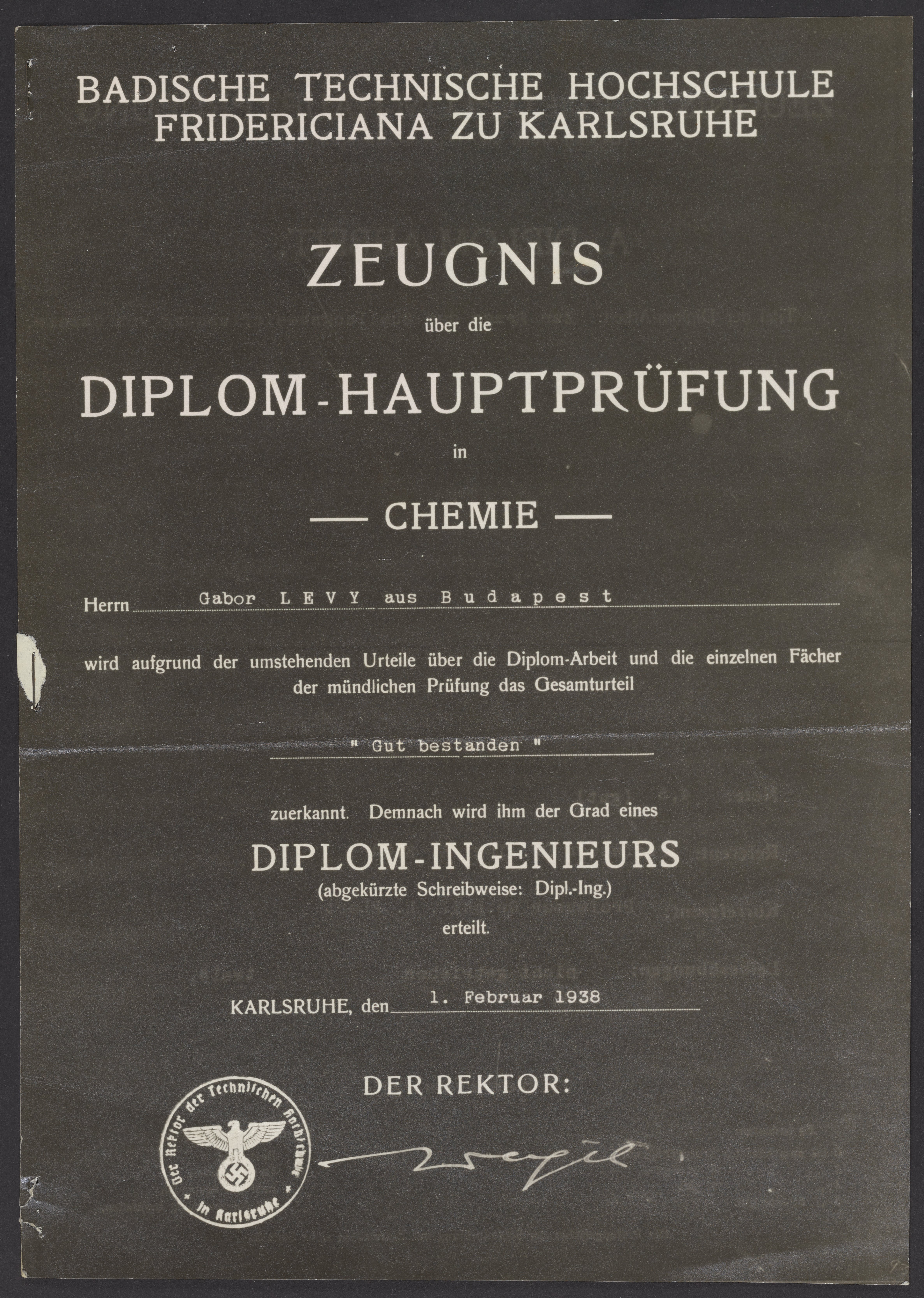 Gabor B. Levy's (1913-1999) chemistry examination certificate, dated February 1, 1938, granting him a Diploma-Ingenieurs (engineer's degree) from Karlsruhe Institute of Technology.