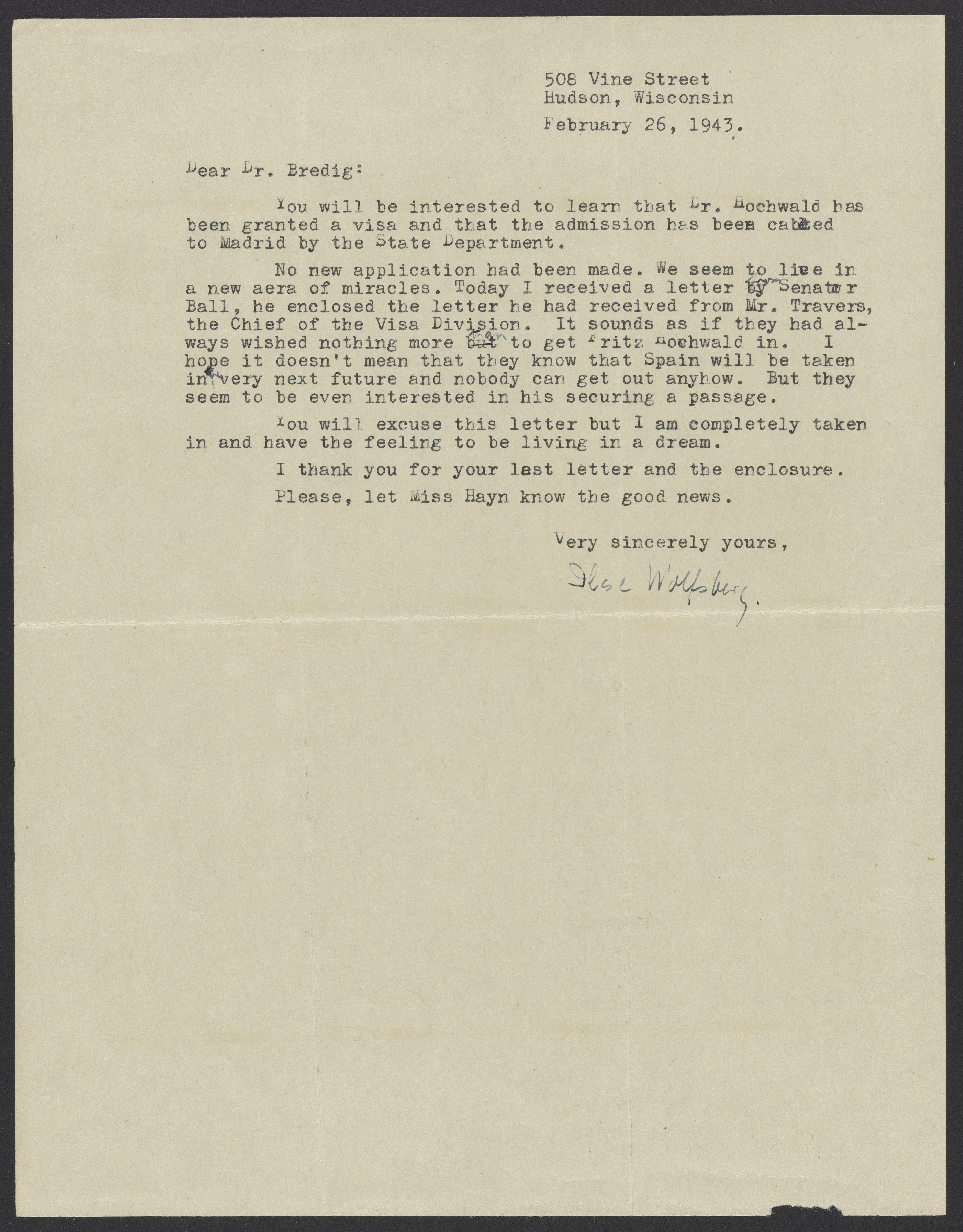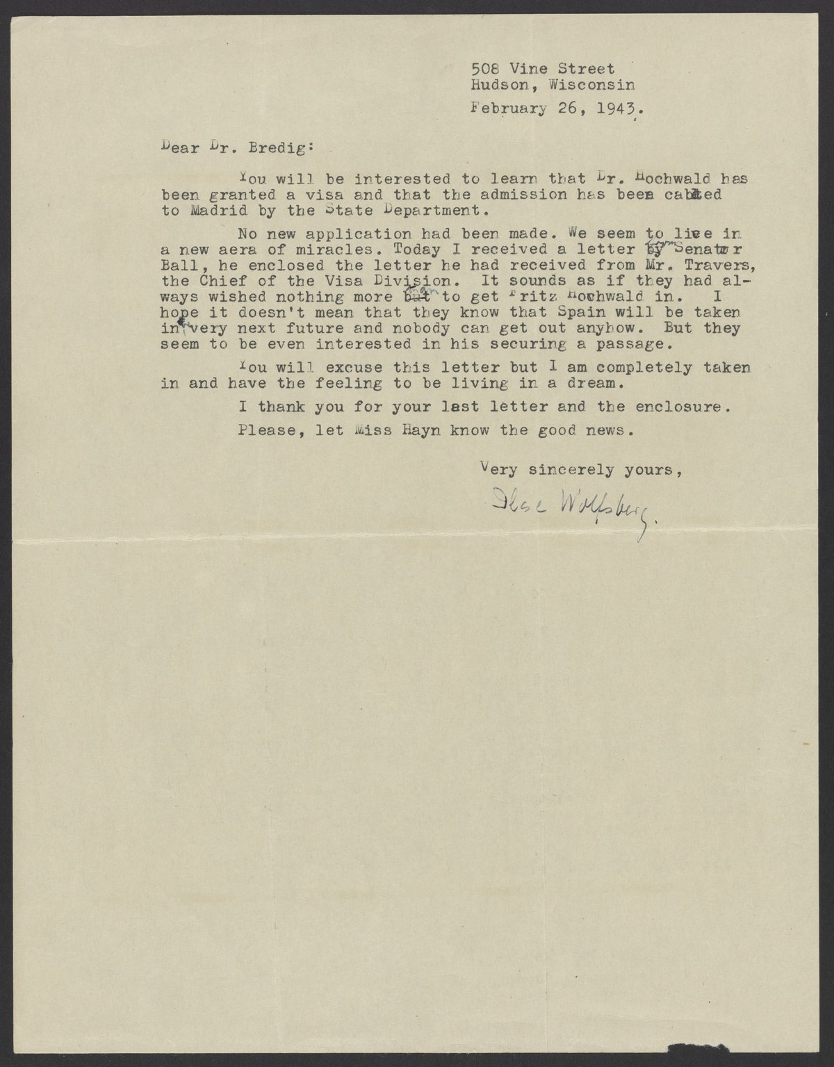 Letter from Ilse Wolfsberg to Max Bredig, February 26, 1943