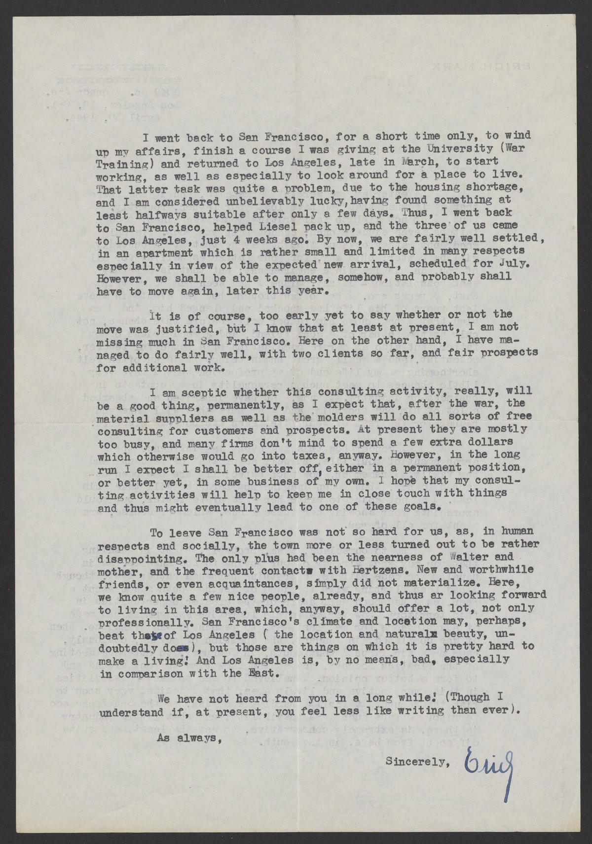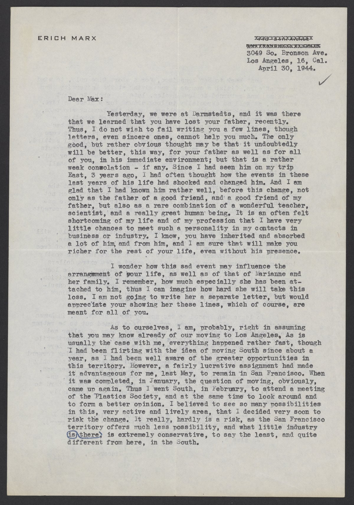 Letter of condolence from Erich Marx to Max Bredig