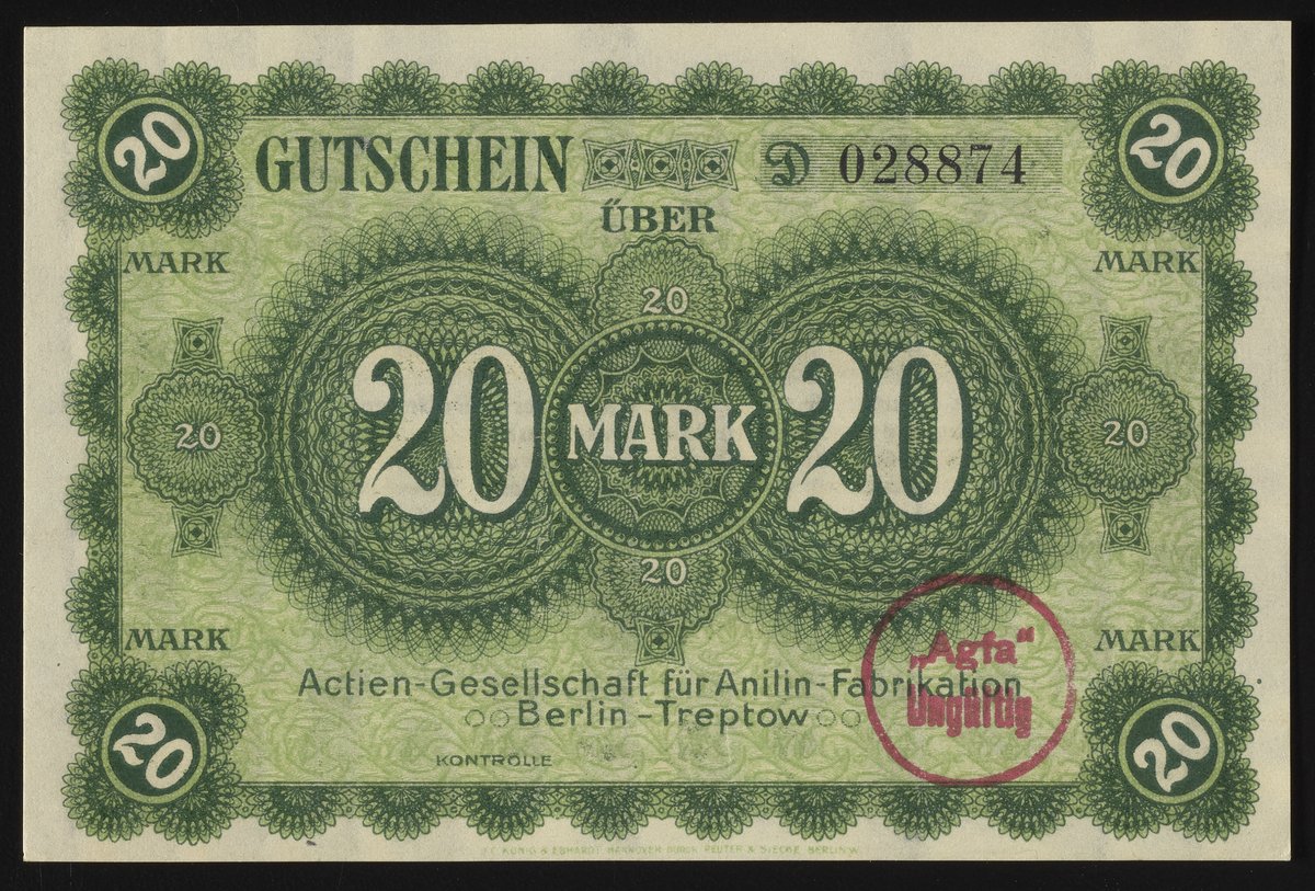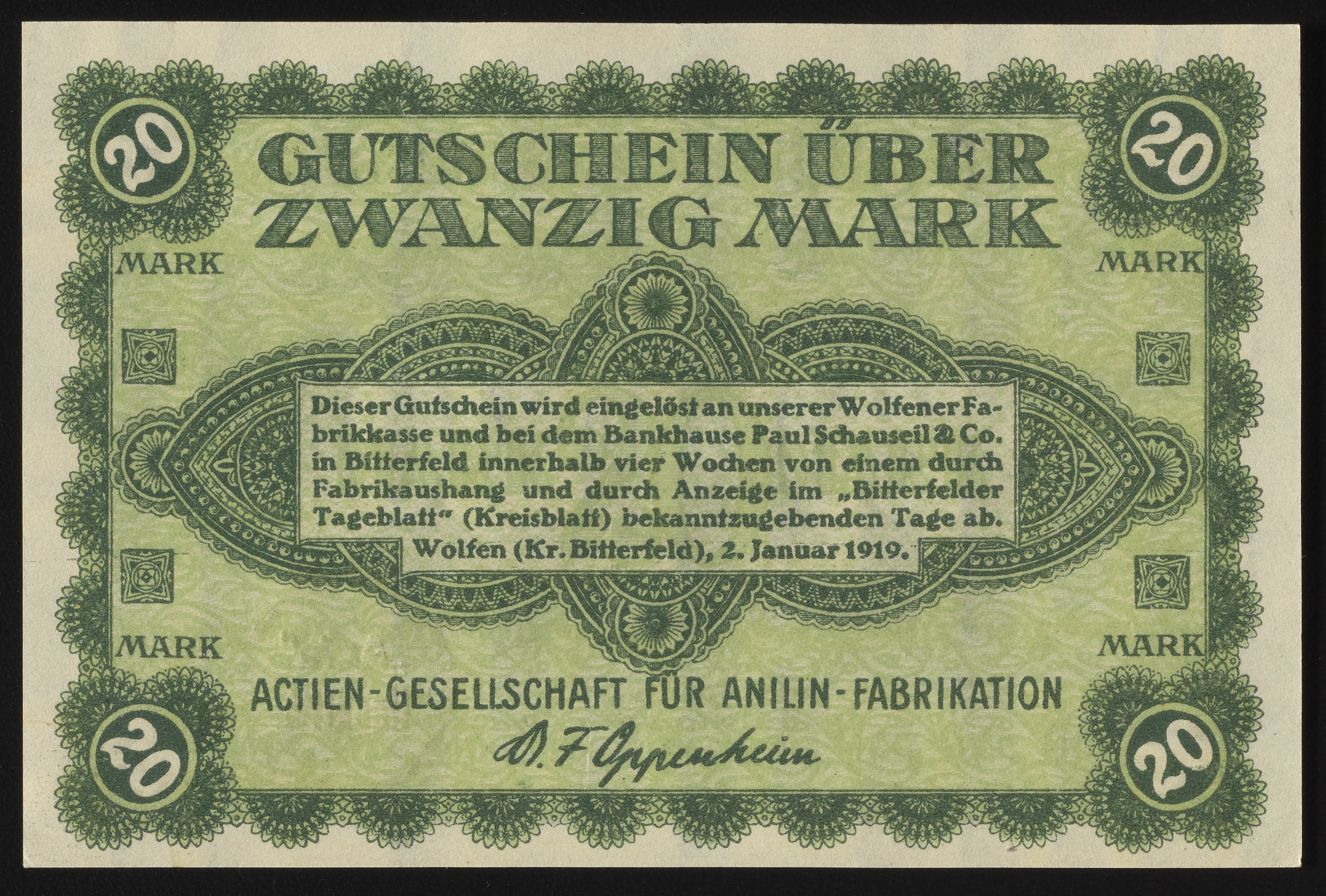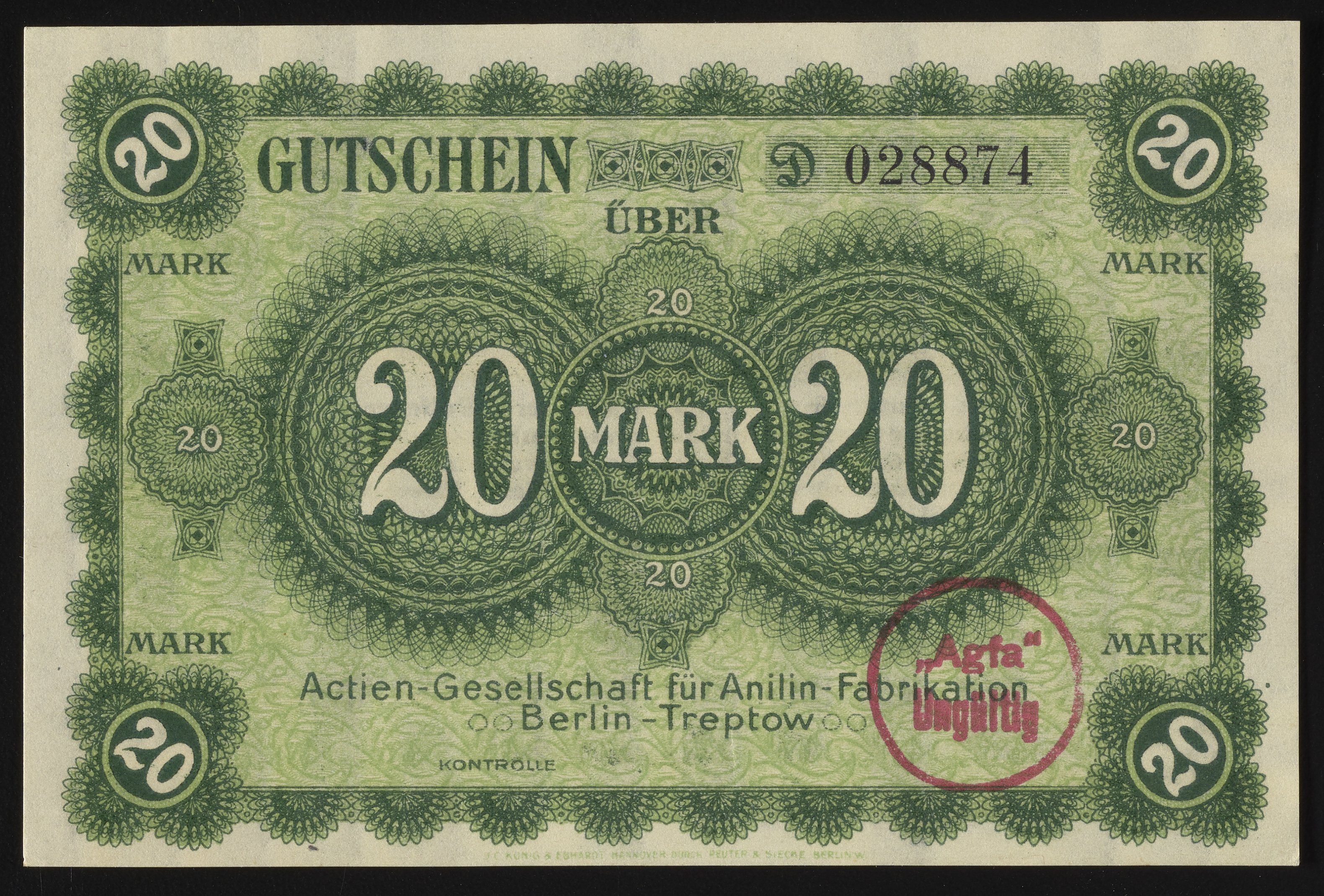 “Aktiengesellschaft Für Anilinfabrikation Twenty Mark Gutschein.” Treptow, Berlin, Germany: Aktiengesellschaft für Anilinfabrikation, January 2, 1919. Robert J. Bauman collection. Science History Institute. Philadelphia. https://digital.sciencehistory.org/works/cn69m517v.