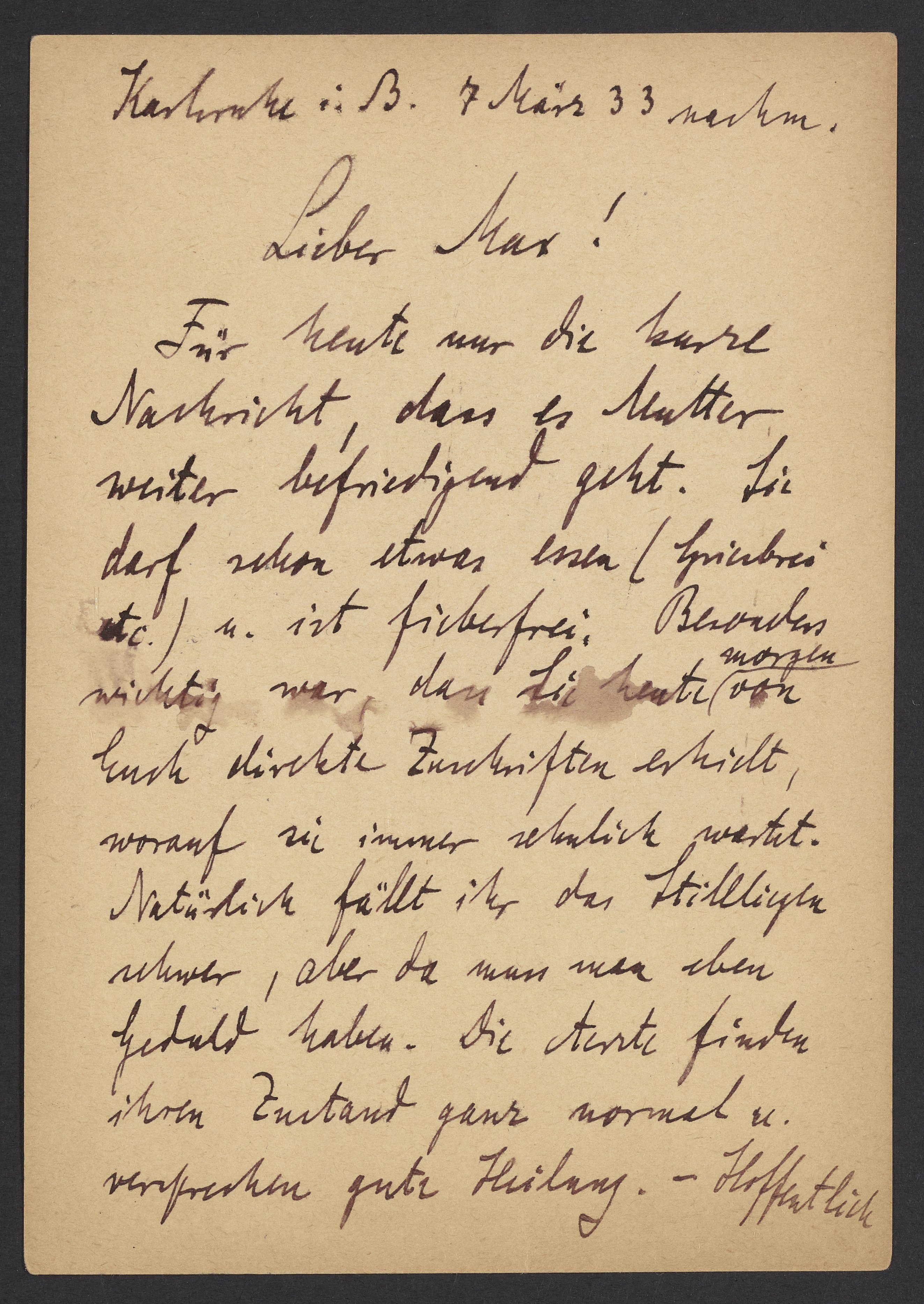 Für heute nur die kurze Nachricht, dass es Mutter weiter befriedigend geht. Sie darf schon etwas essen (Griesbrei) u. ist fieberfrei. Besonders wichtig war dass Sie heute Morgen von Euch direkte Zuschriften erhielt, worauf sie immer sehnlich wartet. Natürlich fällt ihr das Stillliegen schwer, aber da muss man eben Geduld haben. Die Aerzte finden ihren Zustand ganz normal u. versprechen gute Heilung. Hoffentlich