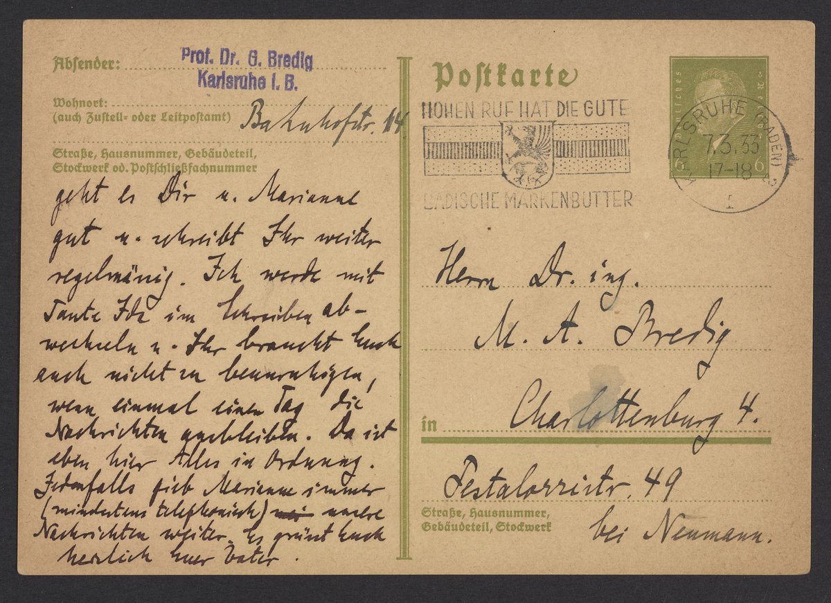 Bredig, Georg. “Postcard from Georg Bredig to Max Bredig, March 7, 1933,” March 7, 1933. Papers of Georg and Max Bredig, Box 7, Folder 10. Science History Institute. Philadelphia. https://digital.sciencehistory.org/works/codvwyn.