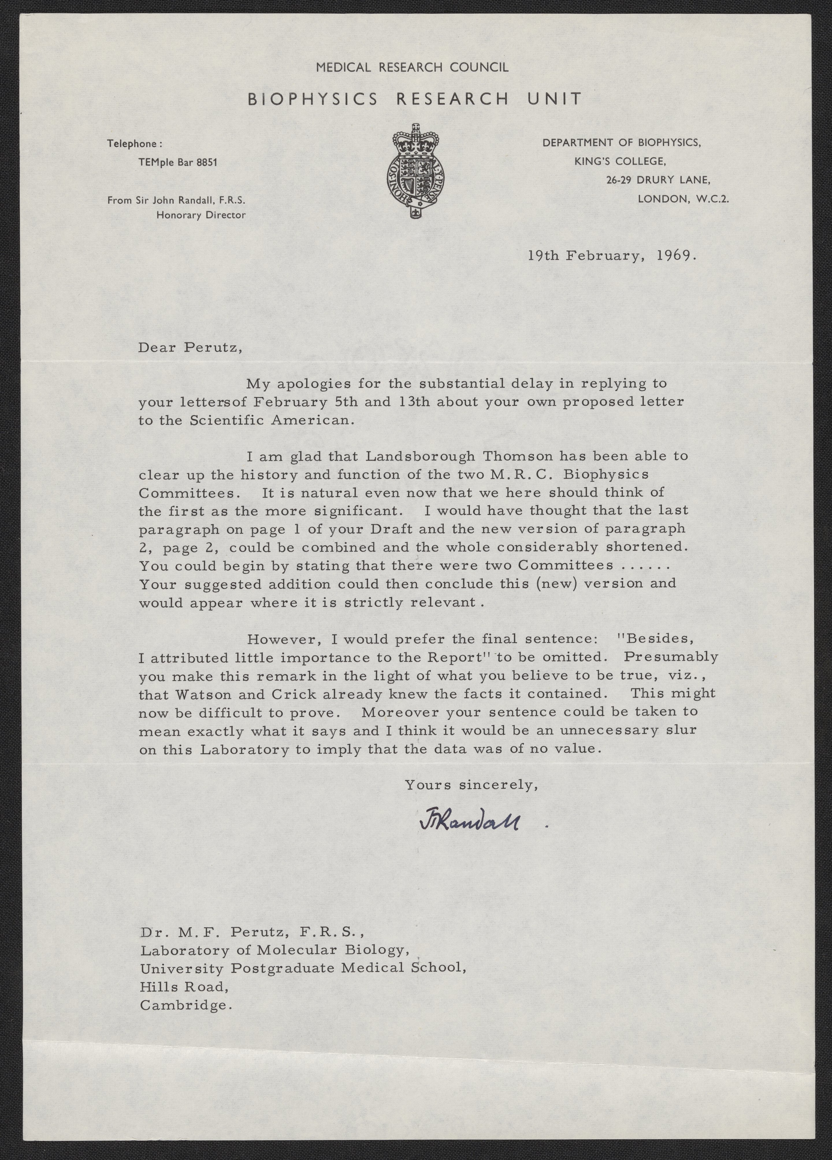 Randall, J. T. (John Turton). “Letter from John Randall to Max Perutz, February 19, 1969,” February 19, 1969. History of Molecular Biology Collection, Box 88, Folder 3. Science History Institute. Philadelphia. https://digital.sciencehistory.org/works/crxkm3b.