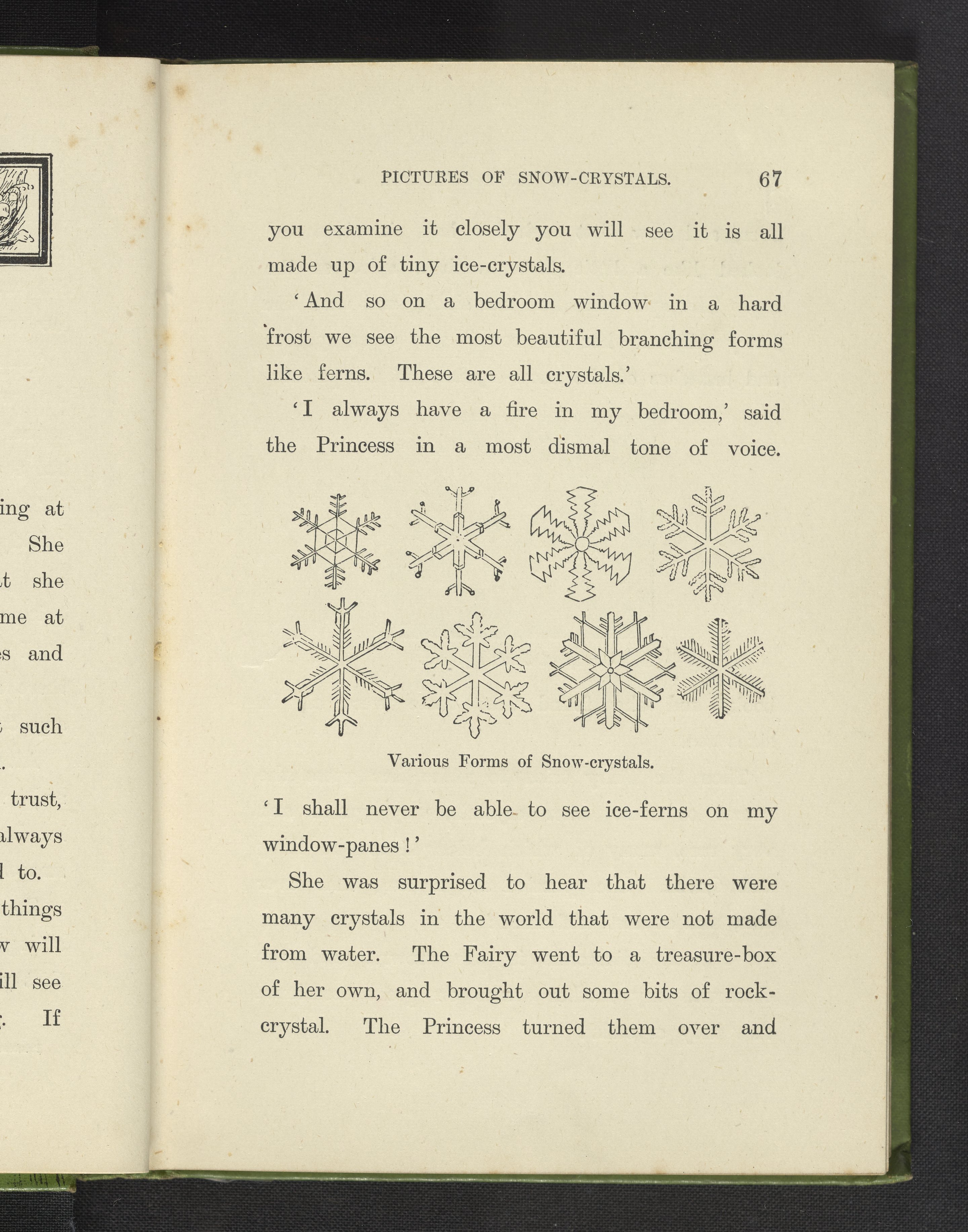 Illustration depicting various forms of snow-crystals from the 1899 volume Princess & Fairy, or The Wonders of Nature. Through the personas of a princess and a fairy, the volume explains different so-called "wonders of nature" to young readers, including insects, several varieties of flowers, snow crystals, metals, and clouds. The volume includes sixty-eight illustrations to augment the information provided.