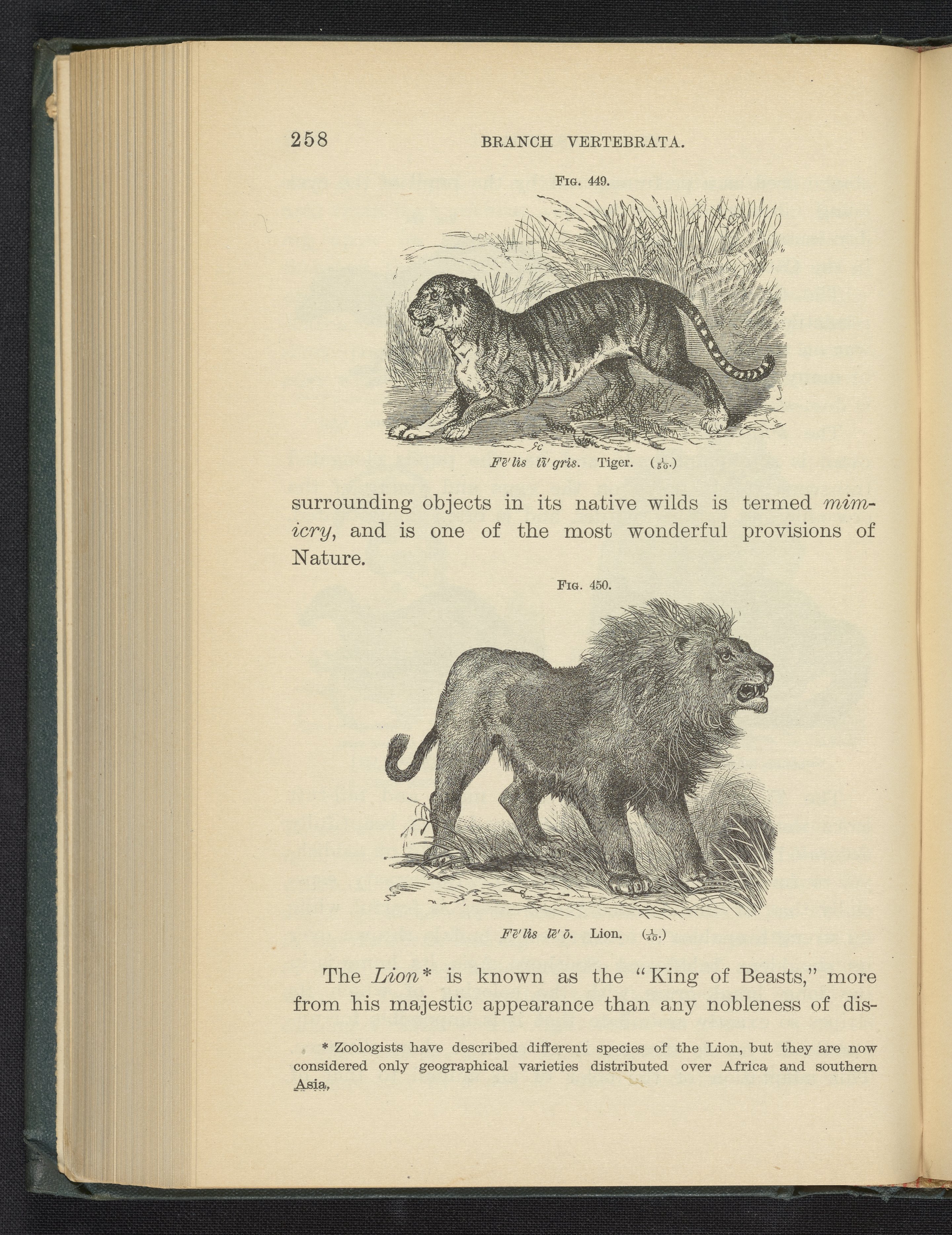 Steele, Joel Dorman, and Jenks, J. W. P. (John Whipple Potter). “Figure 449. Tiger. Figure 450. Lion.” Popular Zoology. New York, New York: Chautauqua Press, 1887. https://digital.sciencehistory.org/works/cui1uy6.