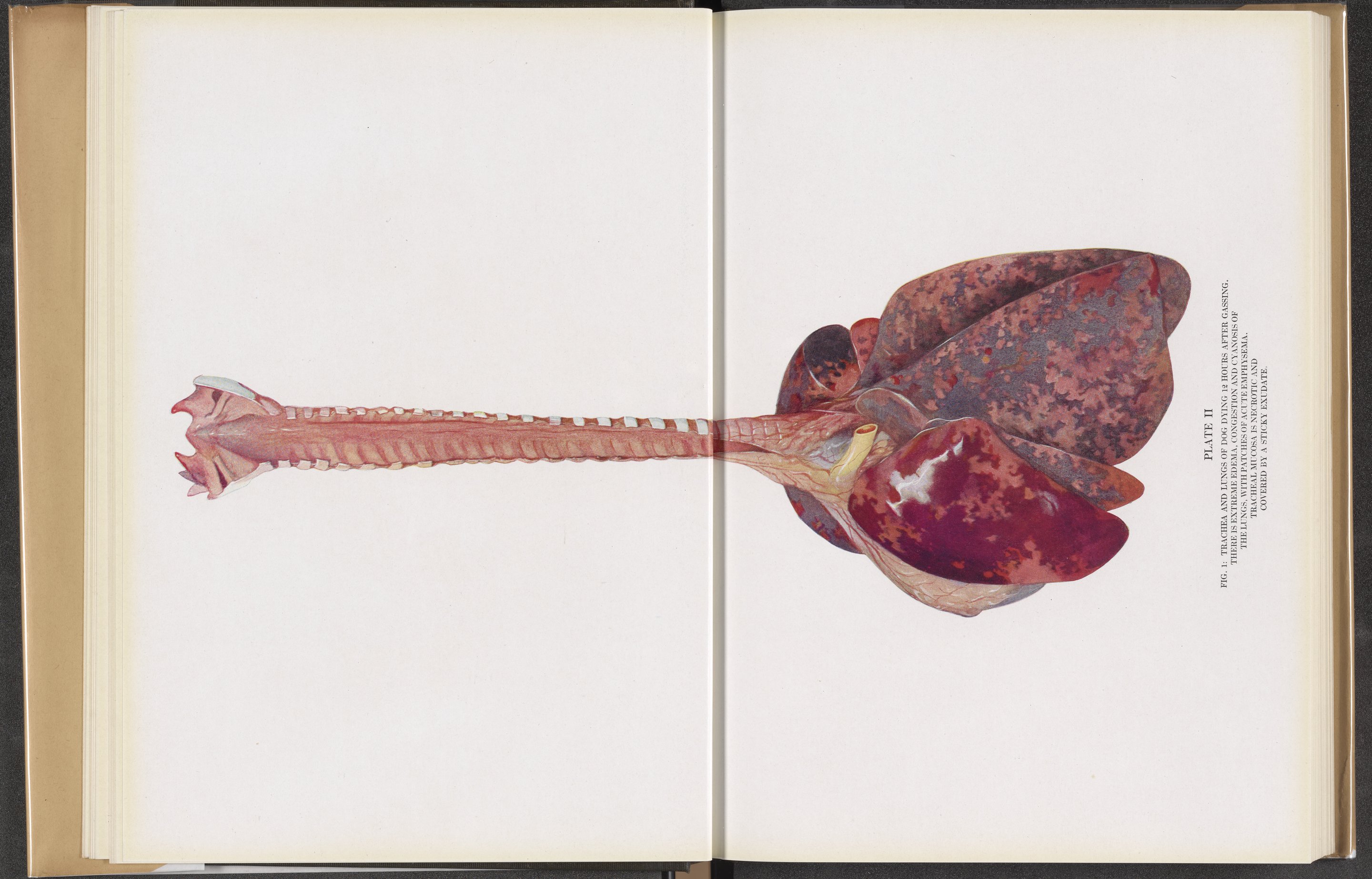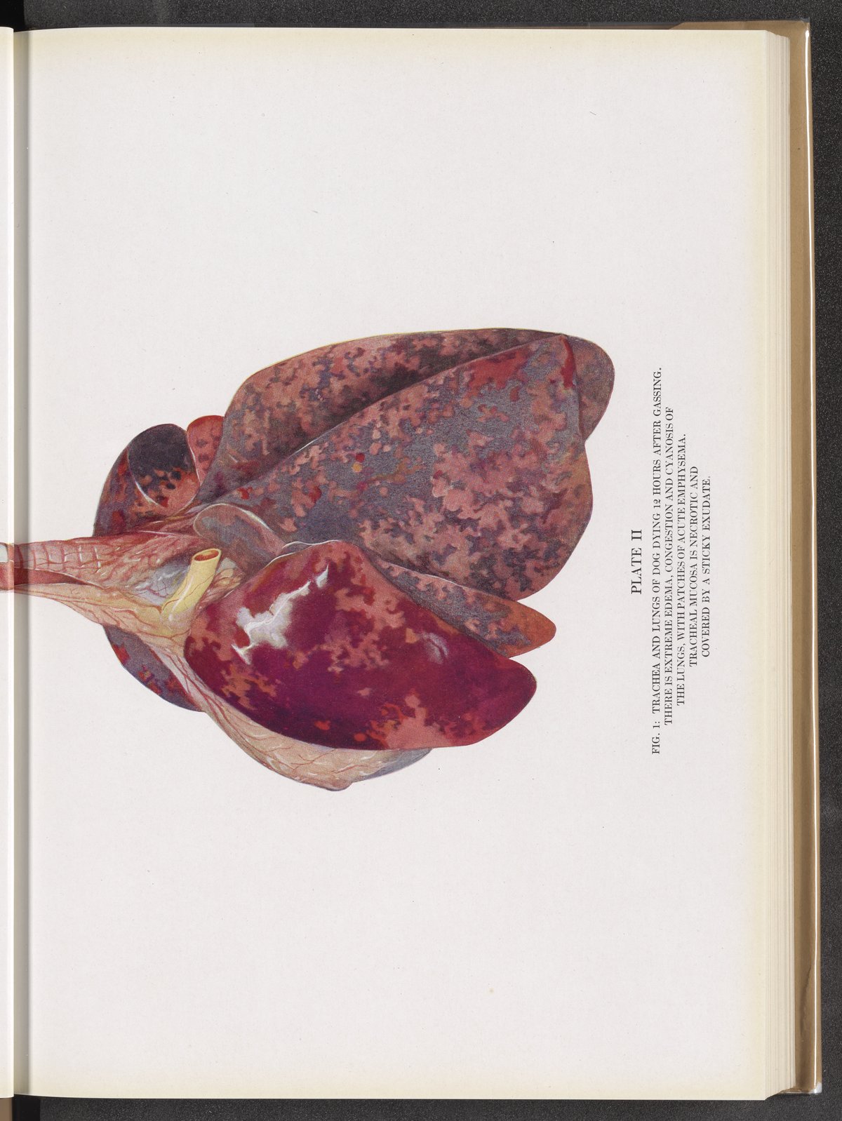 Winternitz, M. C. (Milton C.). “Plate II (Fig. 1): Trachea and Lungs of Dog Dying 12 Hours after Gassing.” Collected Studies on the Pathology of War Gas Poisoning. New Haven, Connecticut: Yale University Press, 1920. https://digital.sciencehistory.org/works/cv43nw97p.