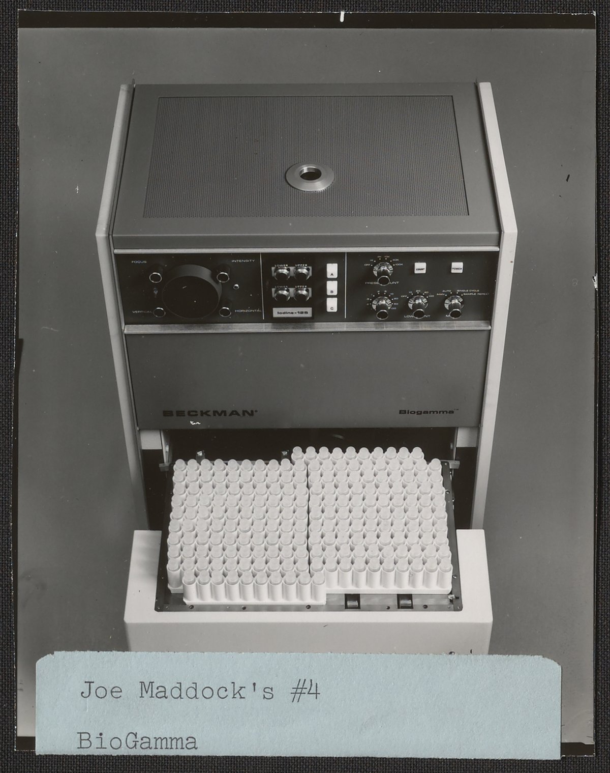 Maddocks, Joe. “Beckman Biogamma Radioimmuno Analyzer,” 1973–1982. Beckman Historical Collection, Box 84. Science History Institute. Philadelphia. https://digital.sciencehistory.org/works/cv43nx080.