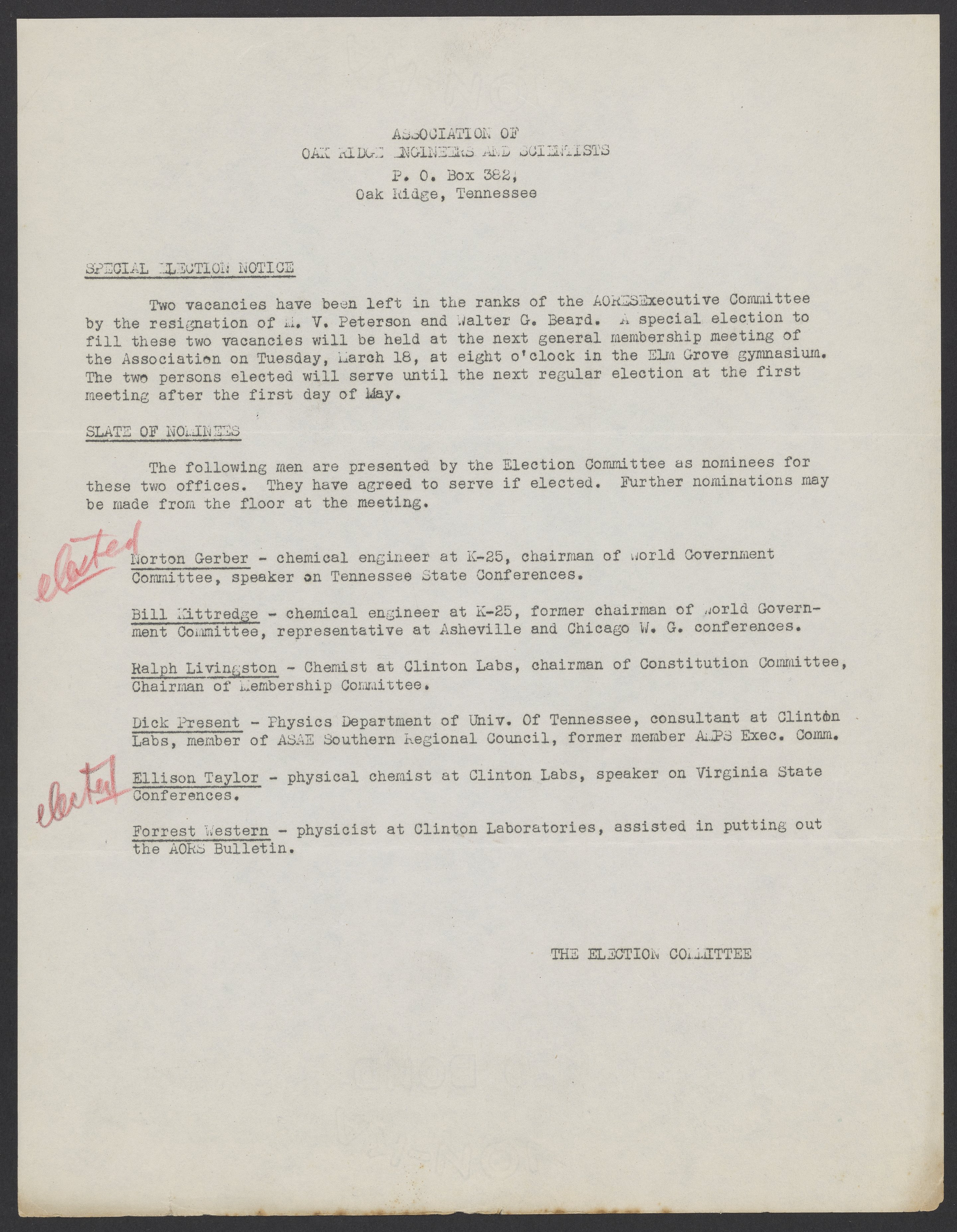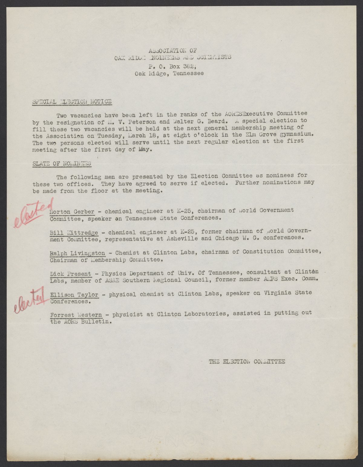 Special election notice for two new members of the executive committee of the Association of Oak Ridge Engineers and Scientists (AORES). Following the notice is a list of nominees and a small biography. Max Albert Bredig (1902-1977) marked the two individuals who were elected, Norton Gerber and Ellison Taylor(1913-).